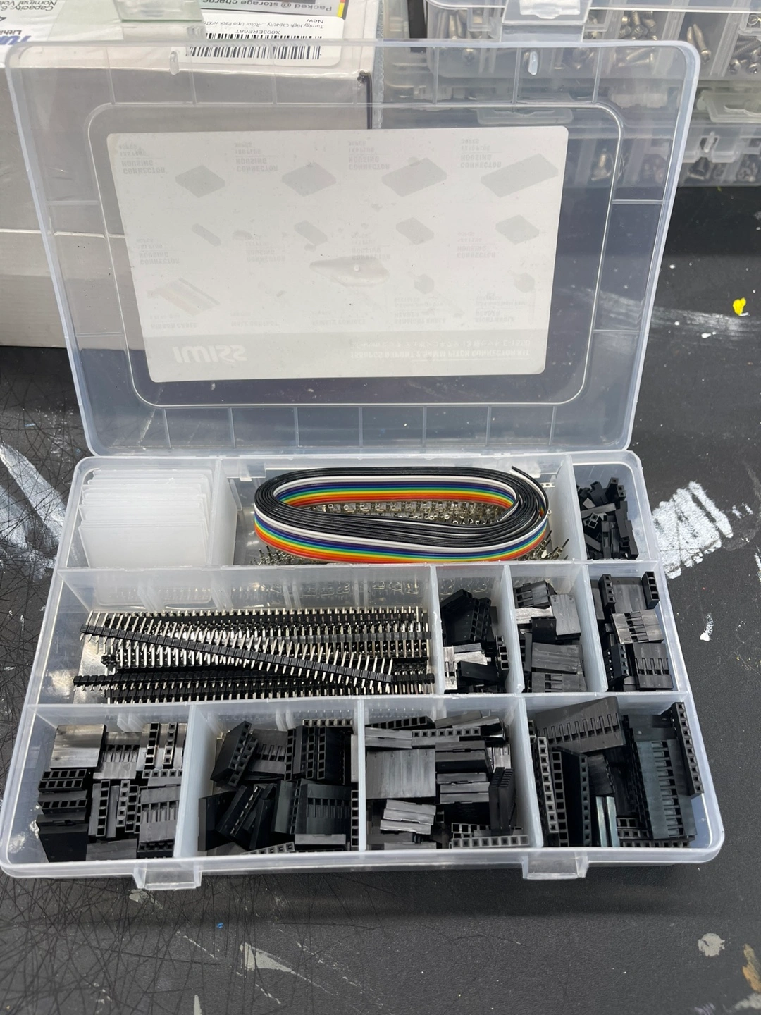 A plastic organizer filled with a variety of electrical components. Includes ribbon cable, male and female contacts, straight and right-angle headers, and connector housings. You can enjoy hours of peace with this kit and build projects.