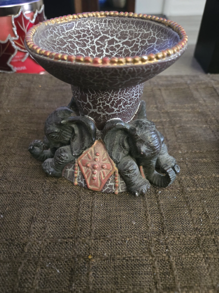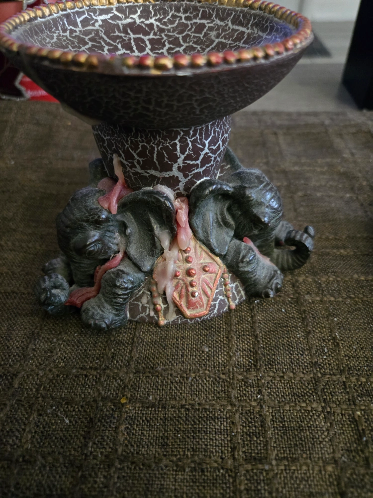 Unique statue, featuring elephants holding a bowl. Decorated with an interesting, crackled design. A decorative and functional piece that can be used to hold small items, or for display purposes, such as a candle holder.