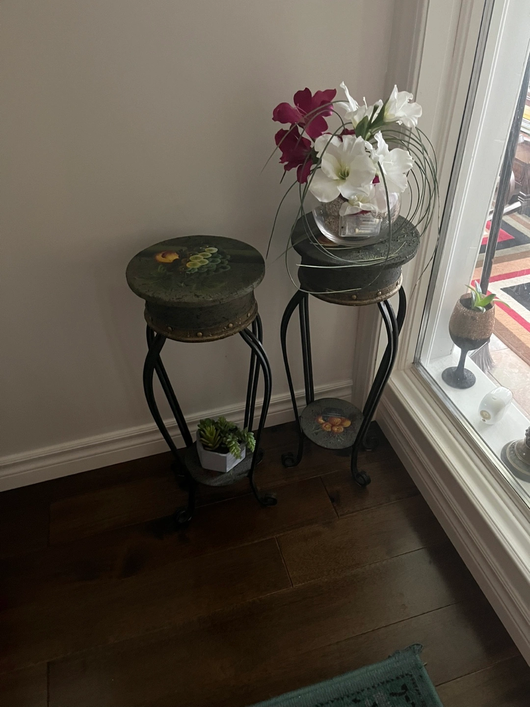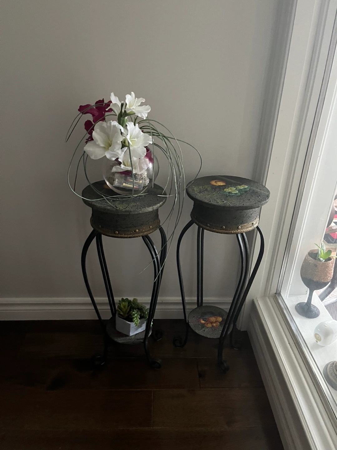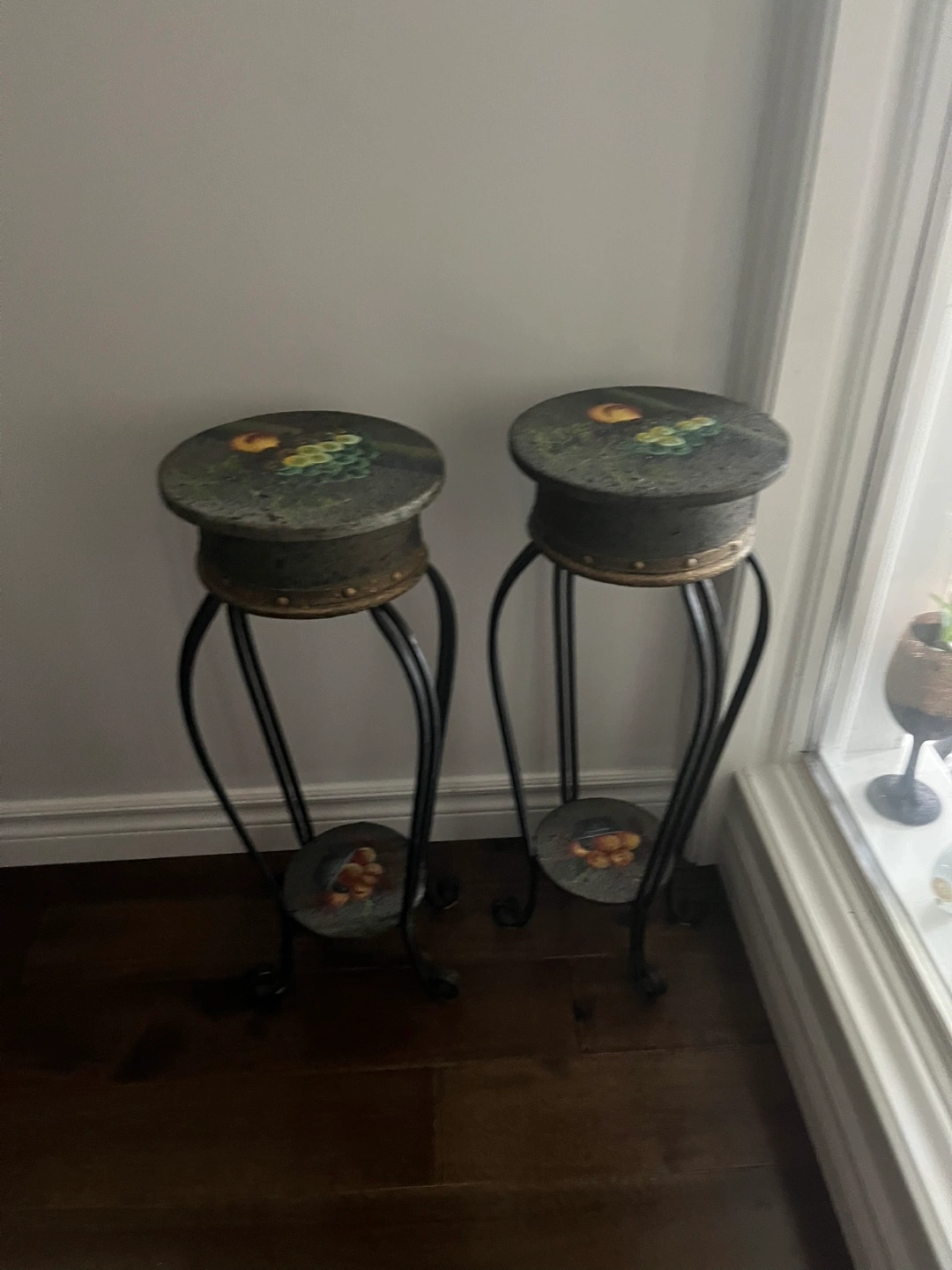 30Matching pair of plant stands. Features a decorative floral design. Has intricate metalwork. Could look perfect in any corner of your home for a peaceful moment. Pots not included