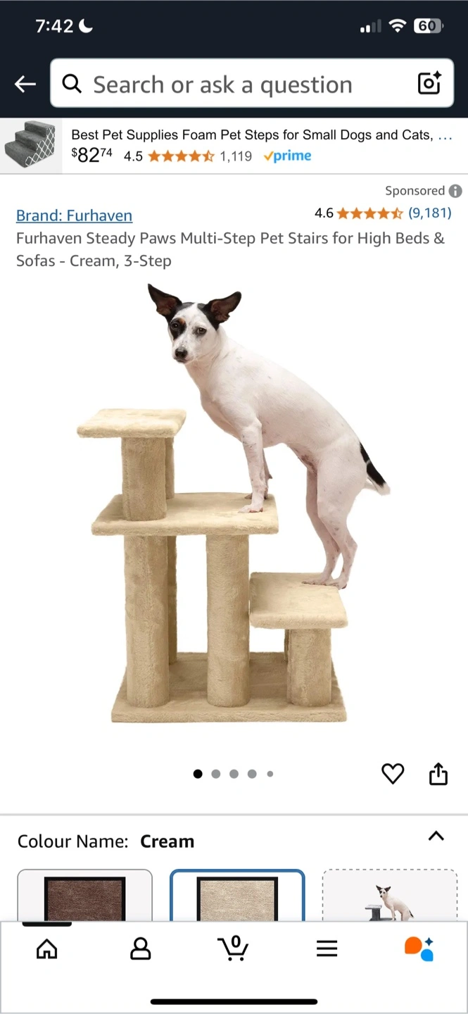 Soft cream-coloured pet stairs. Three tiers for your pet. This is perfect to allow your small dog or cat to relax comfortably. This includes an Allen key, but not instructions. There are tutorials on YouTube.
