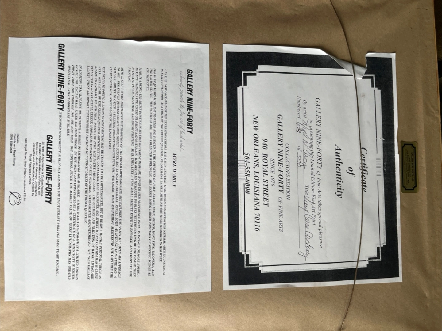A lovely framed art print, featuring a street scene under an arch. Classic New Orleans style. This is a limited edition. Number 63 of 500. Autographed by the artist. The frame is gold in colour.