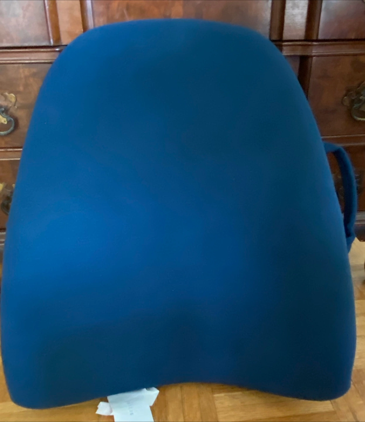 A blue backrest support. Features a handle and strap. Built-in lumbar support. Adjustable to fit your needs. Great for supporting your posture while you relax and read.