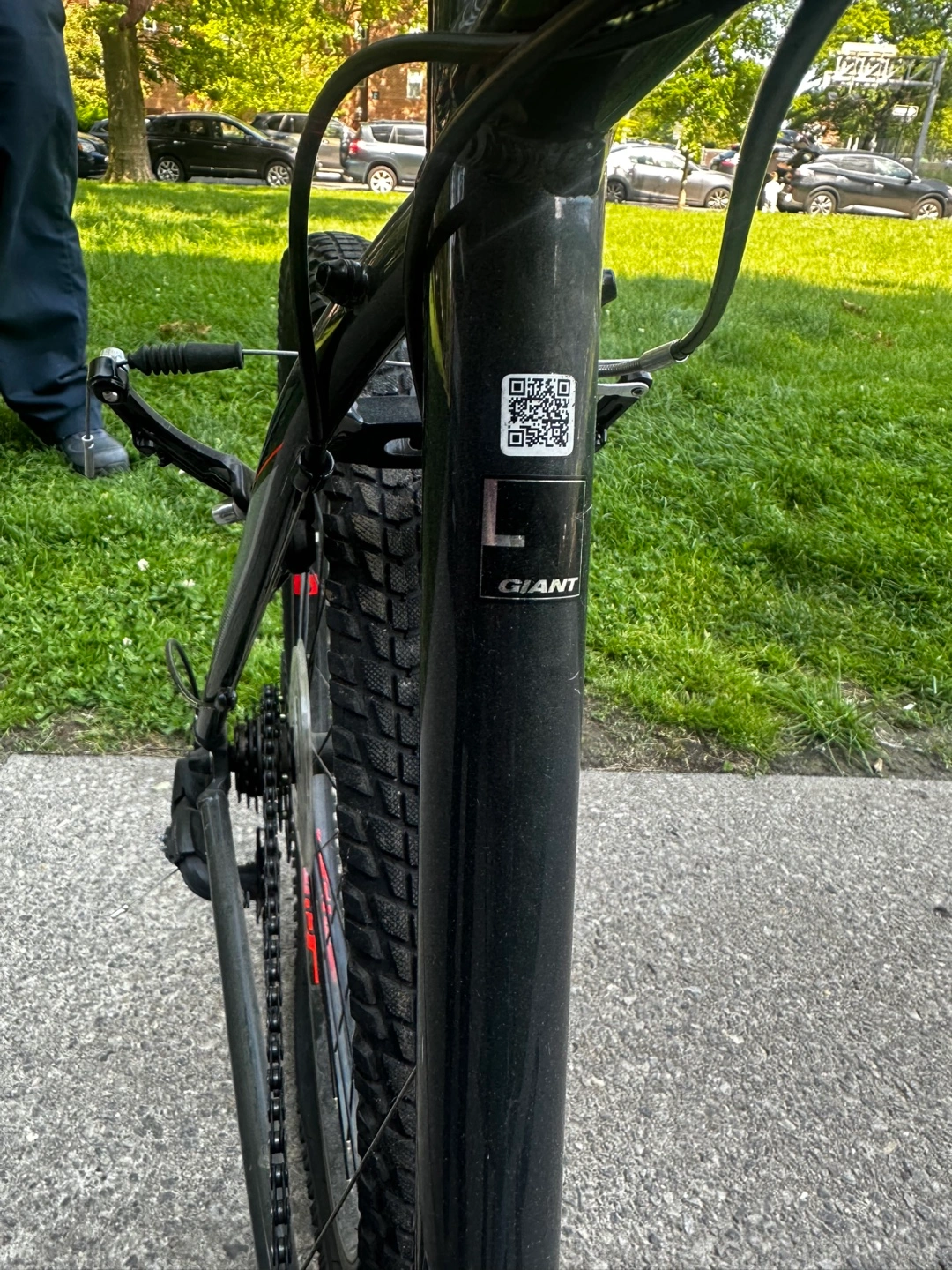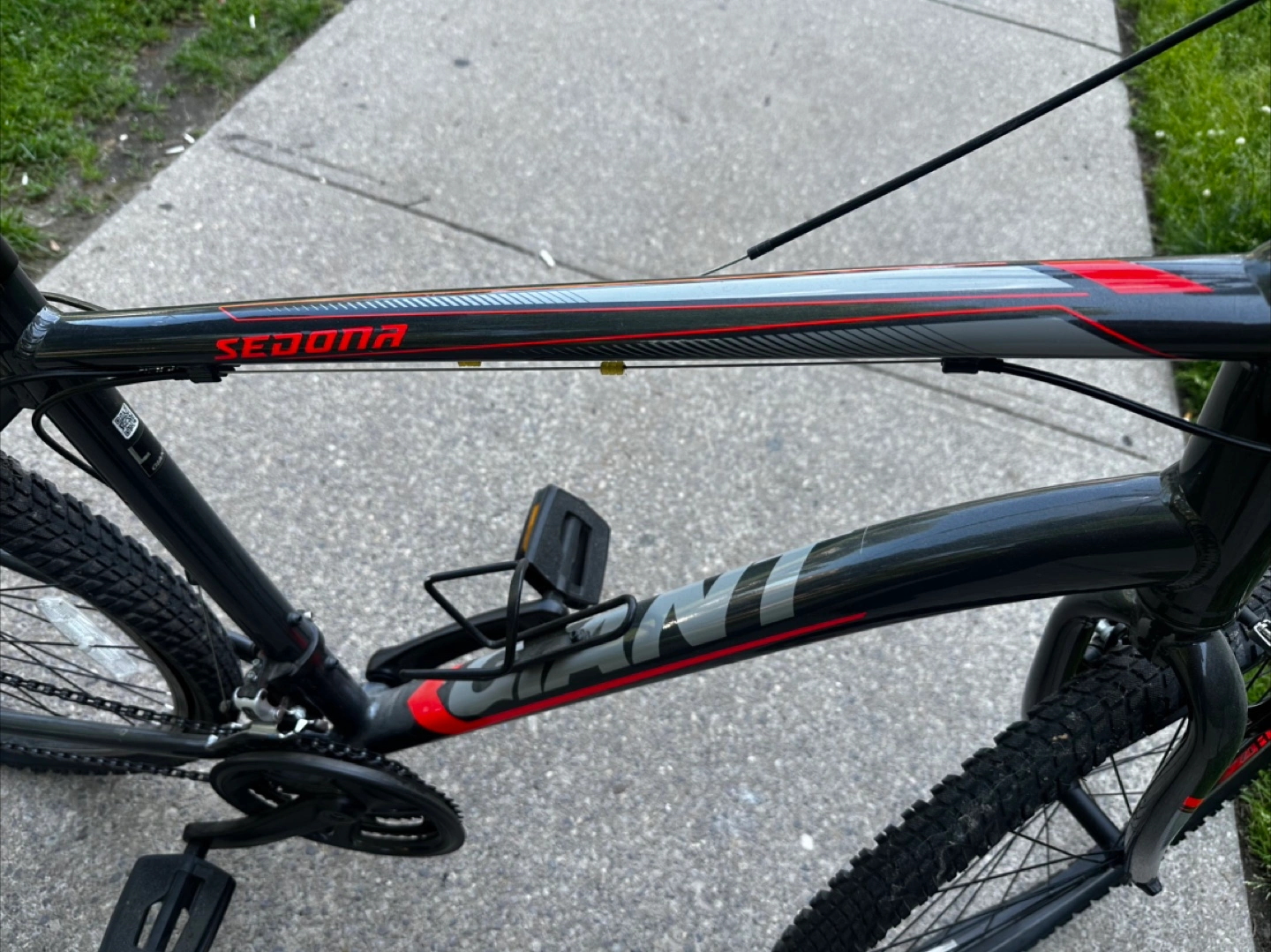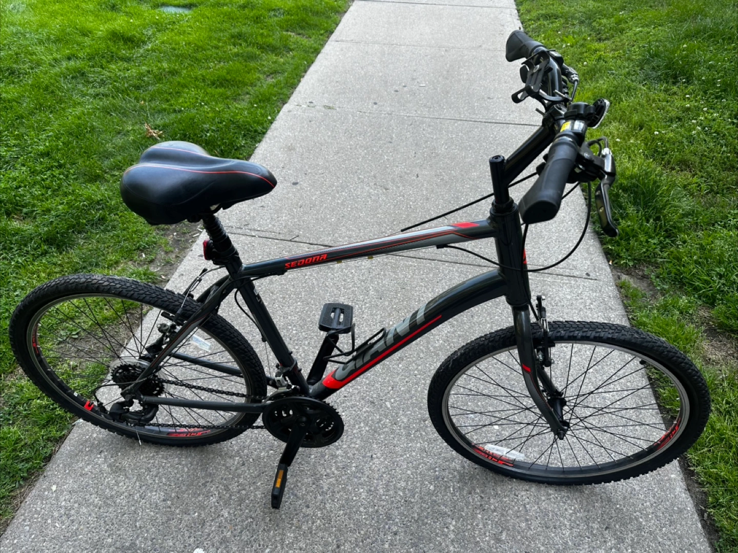 Bike with a black frame. The tires are black. Features a black seat with red accents. Consider the tranquility of a leisurely ride on this bike.