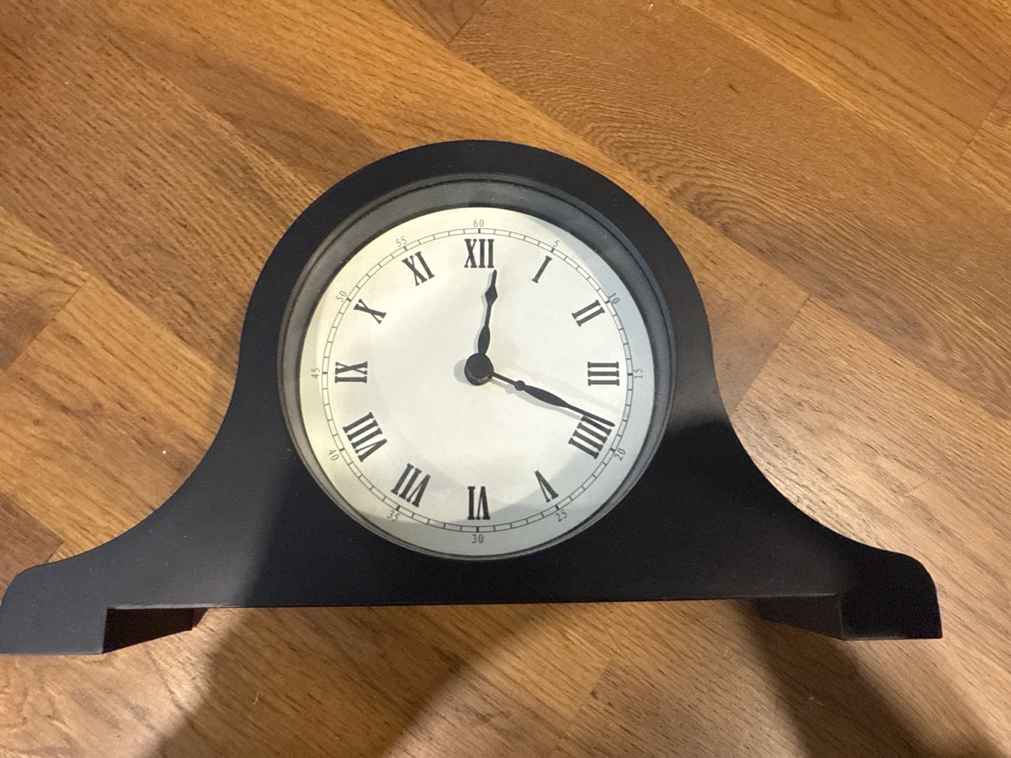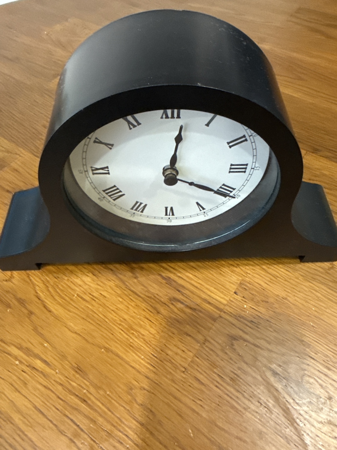 Black clock. Roman numerals. Battery compartment on the back. Perfect for your bedside table. Cash and pick up.