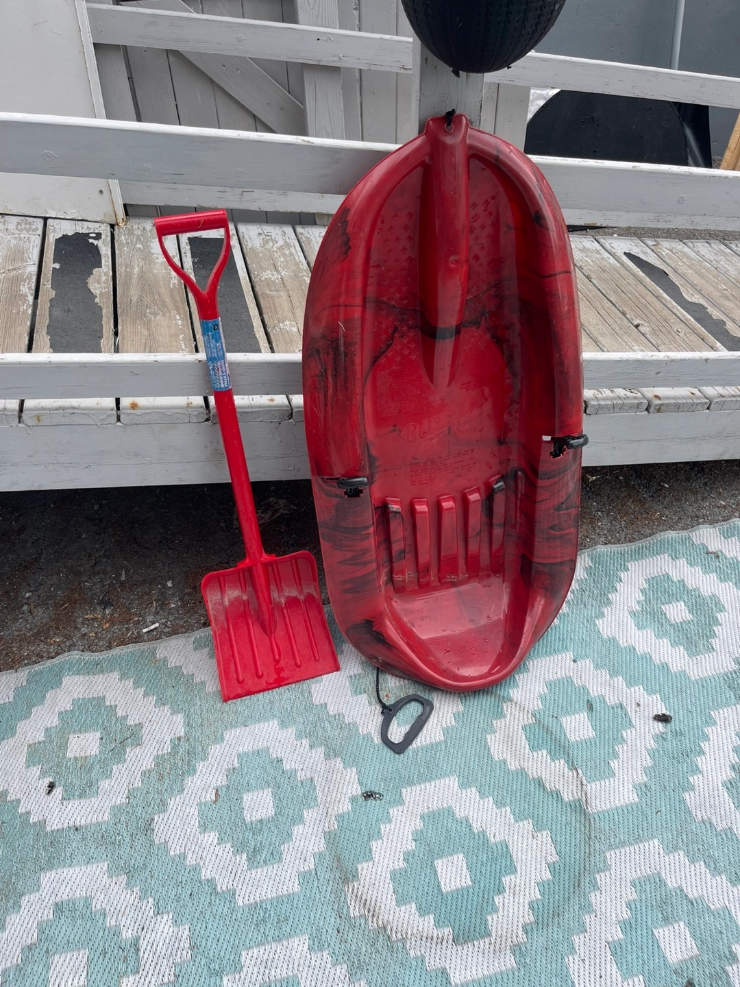 This fun combo for winter fun will surely bring a smile to your face. A red plastic sled, with rope and molded features. Includes a matching red plastic shovel. Perfect for the snow days ahead.