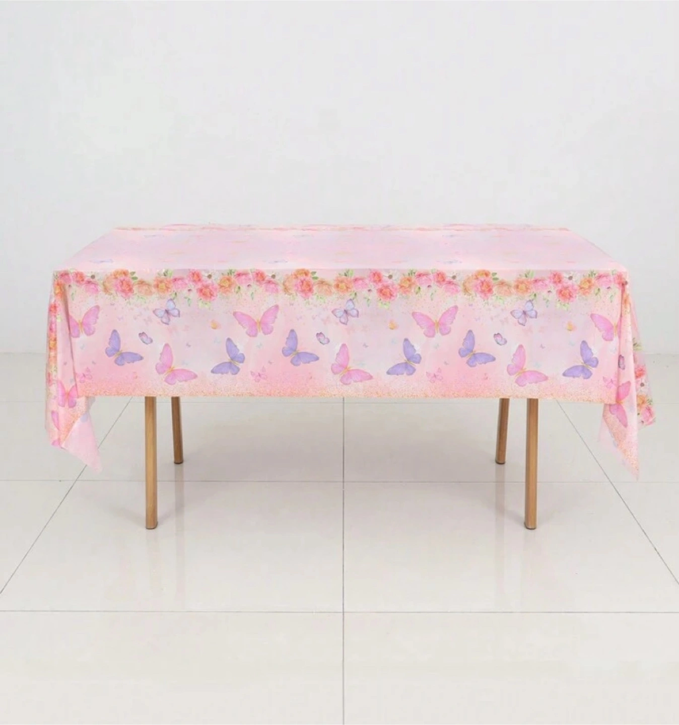 Tablecloth decorated with butterflies and flowers. Pink background. Great for your next party or event