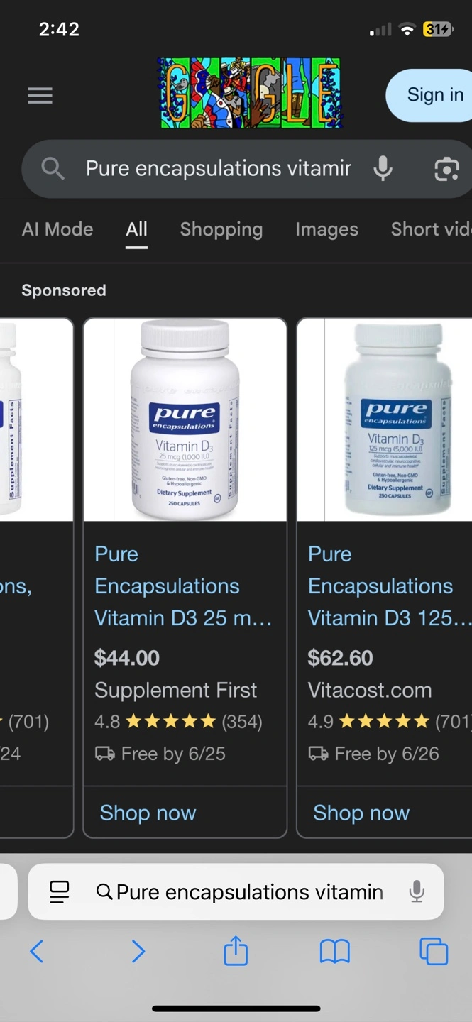 Unopened White supplement bottle with a sealed top. Bottle contains 250 caps Vitamin D3 capsules.