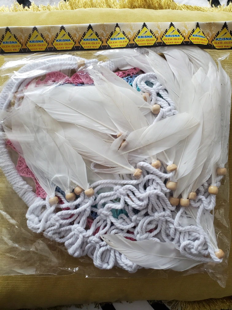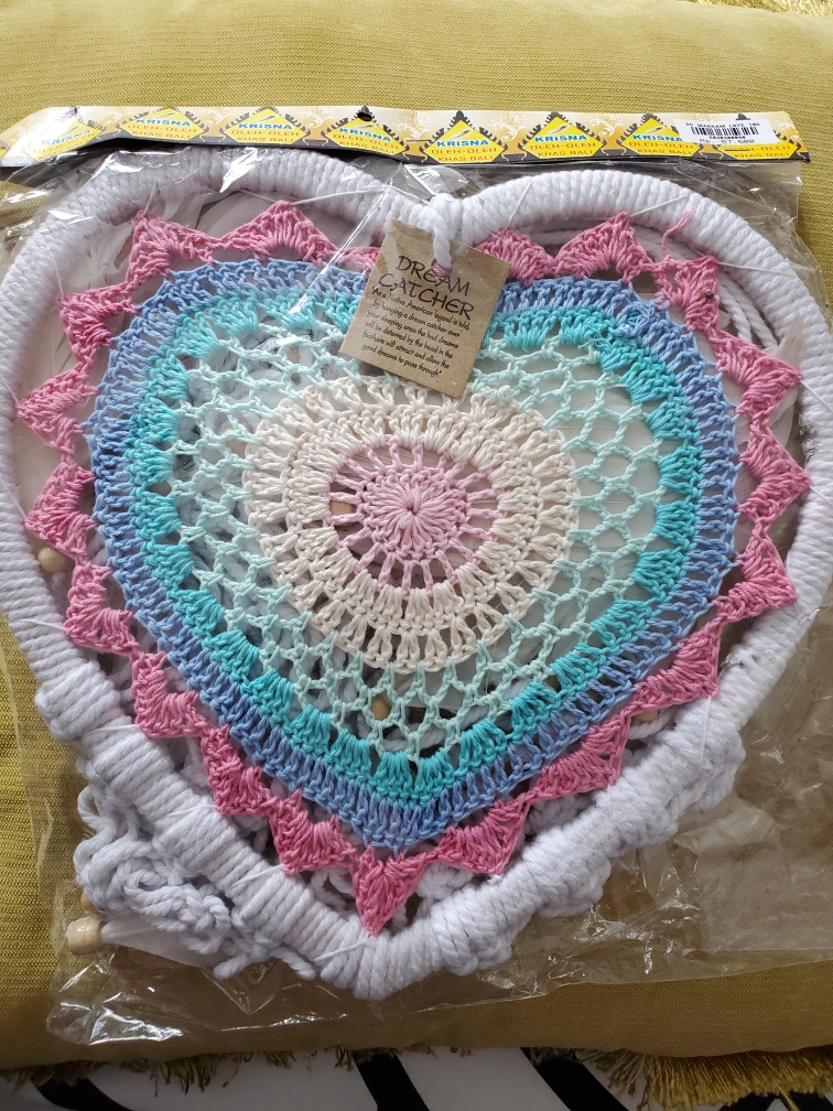 Dream catcher still in its original packaging. Heart-shaped design with feathers. A beautiful item to display in your bedroom to ward off any bad dreams.