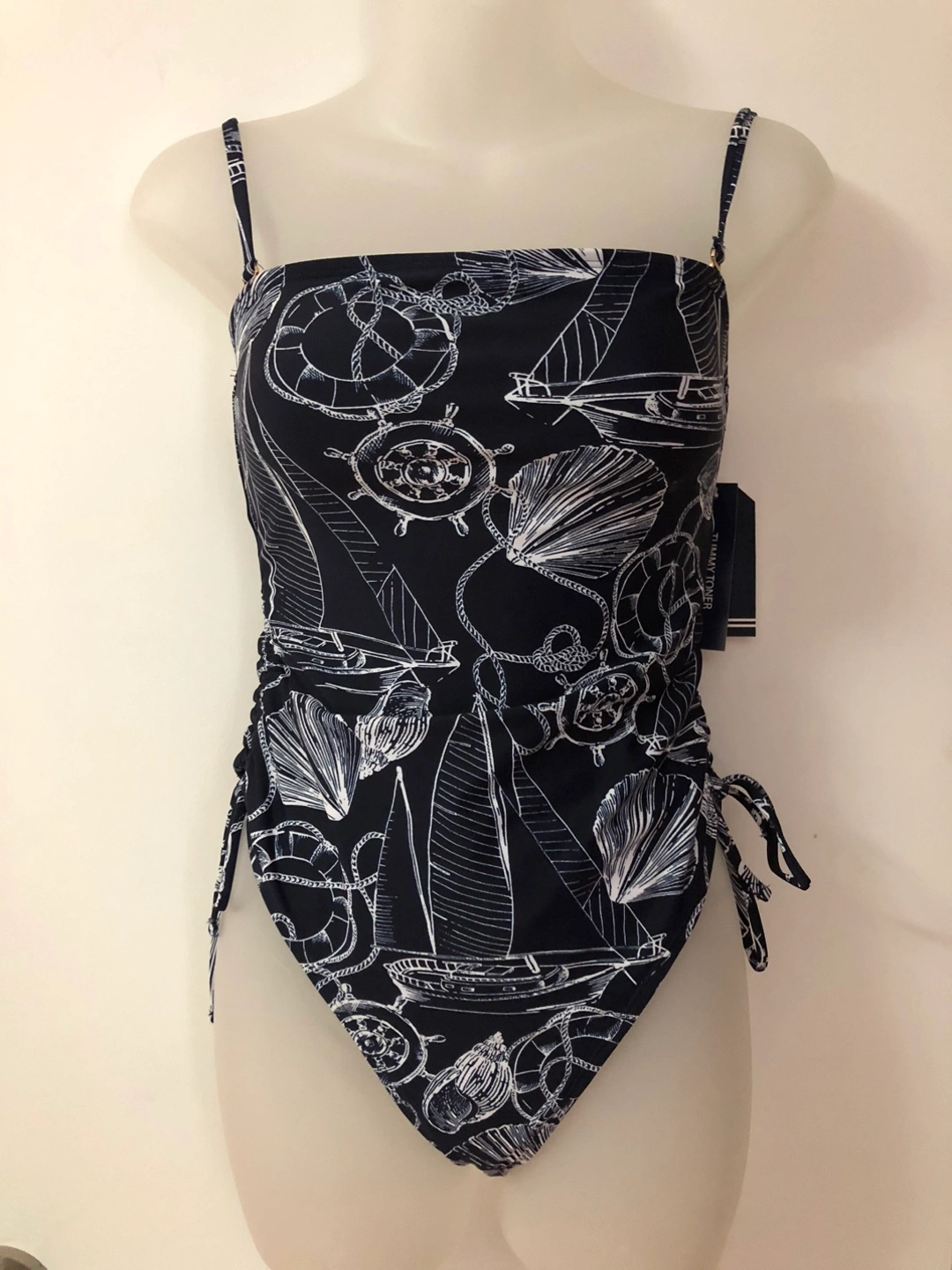 Brand New One-piece swimsuit in navy blue, with a nautical print. The swimsuit has adjustable straps. Liner still in place.
