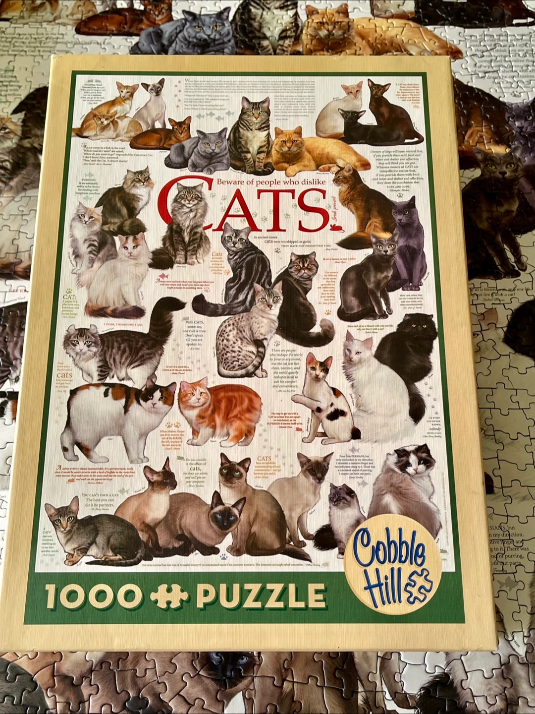 Looking to add some feline fun to your next puzzle night? This Cobble Hill puzzle features a charming collage of cats and fun facts. It's a 1000 piece puzzle, perfect for a cozy evening in! Excellent condition. No pieces missing. Please see my other listings for more puzzles.
