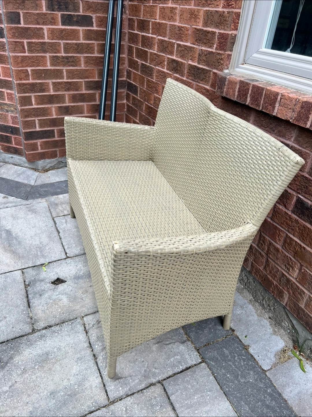 Selling a lovely wicker outdoor loveseat! It's in great condition and perfect for relaxing on your patio or deck. The neutral colour will match any outdoor decor