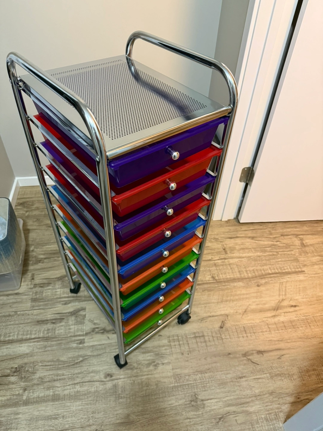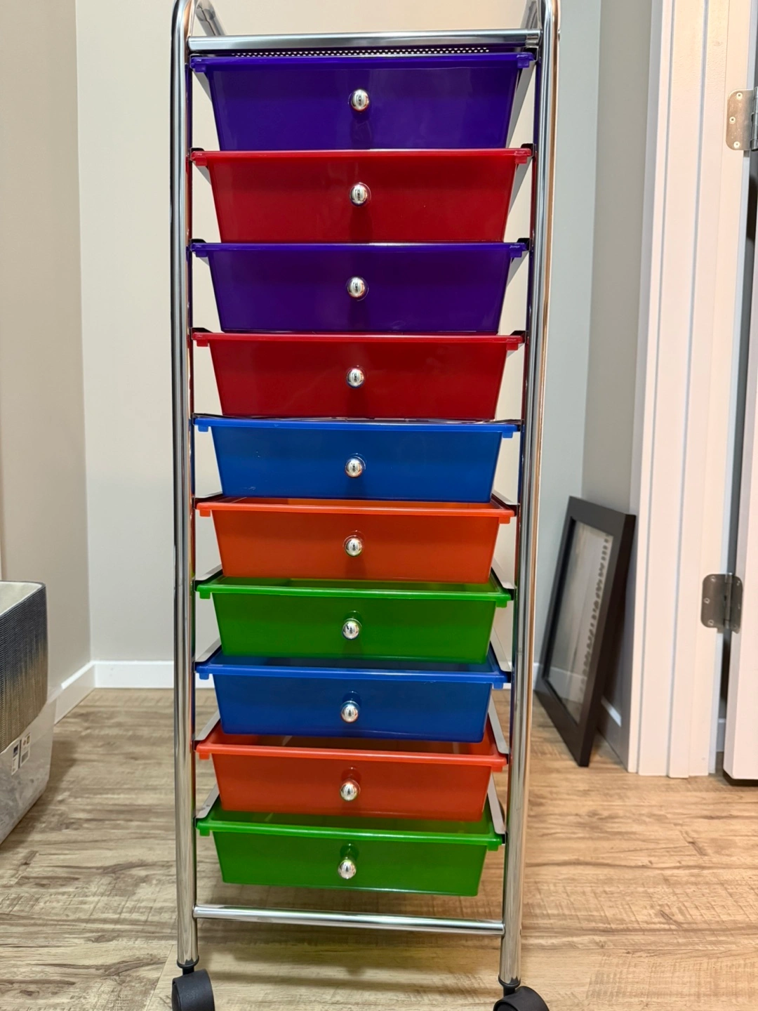 Get organized with this handy rolling storage cart! It features 10 colourful drawers, perfect for craft supplies, office essentials, or anything you need to keep tidy. The cart is on wheels, making it easy to move around your space. The wheels can also lock!