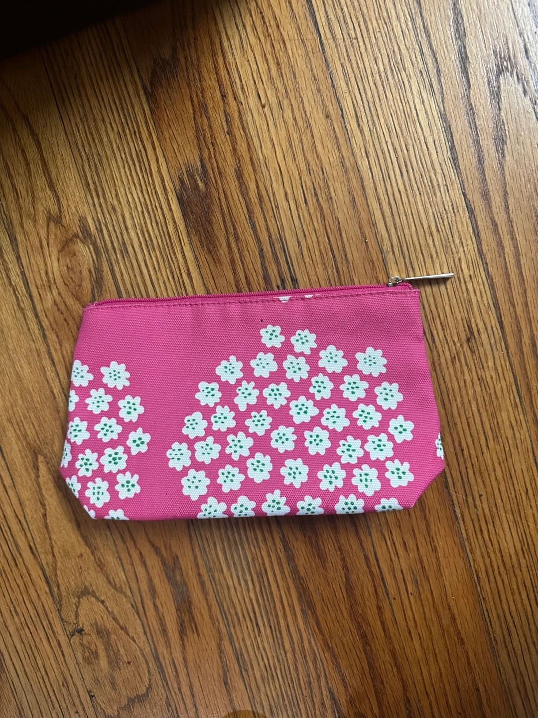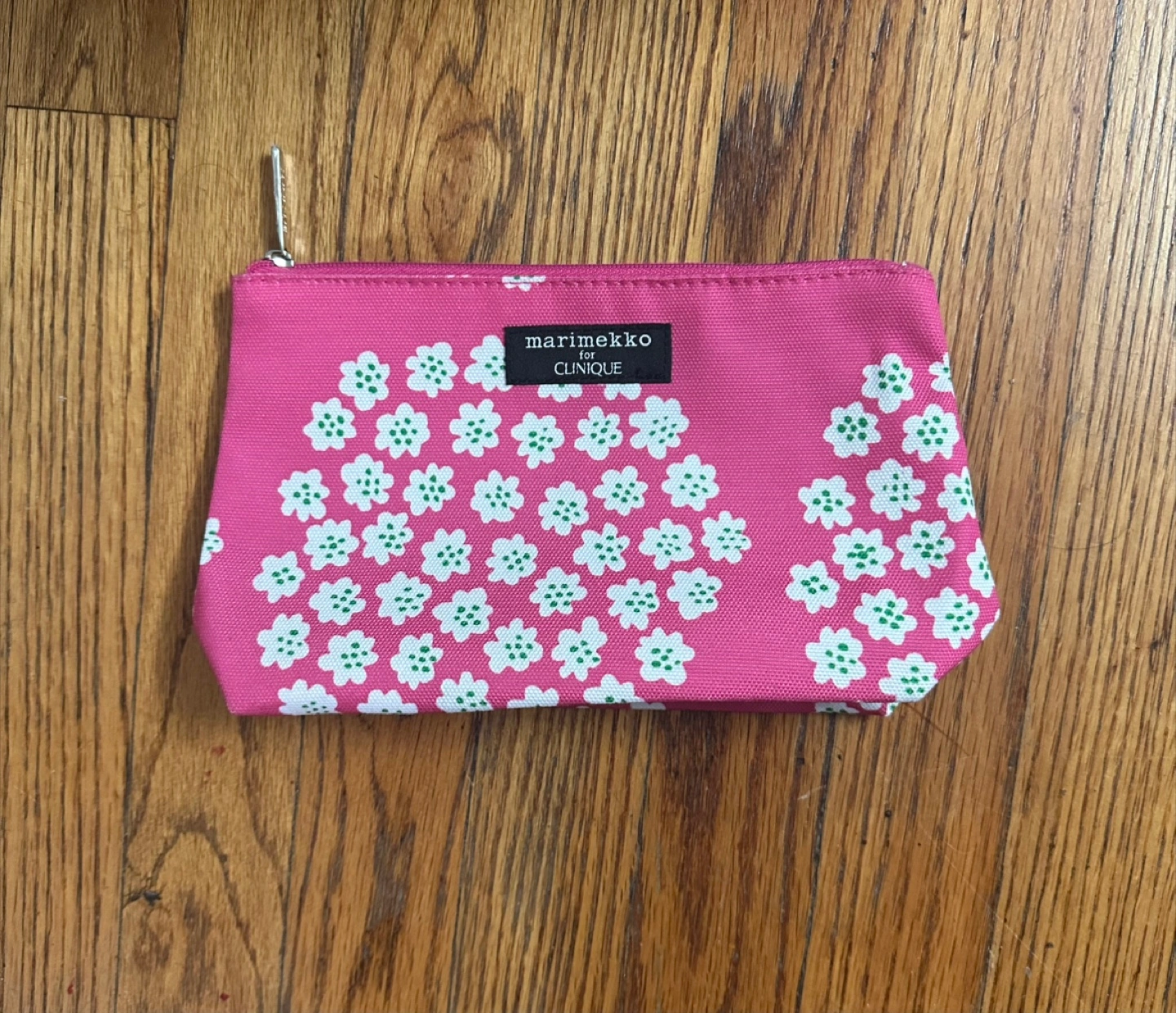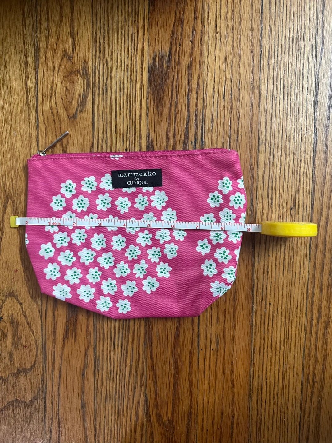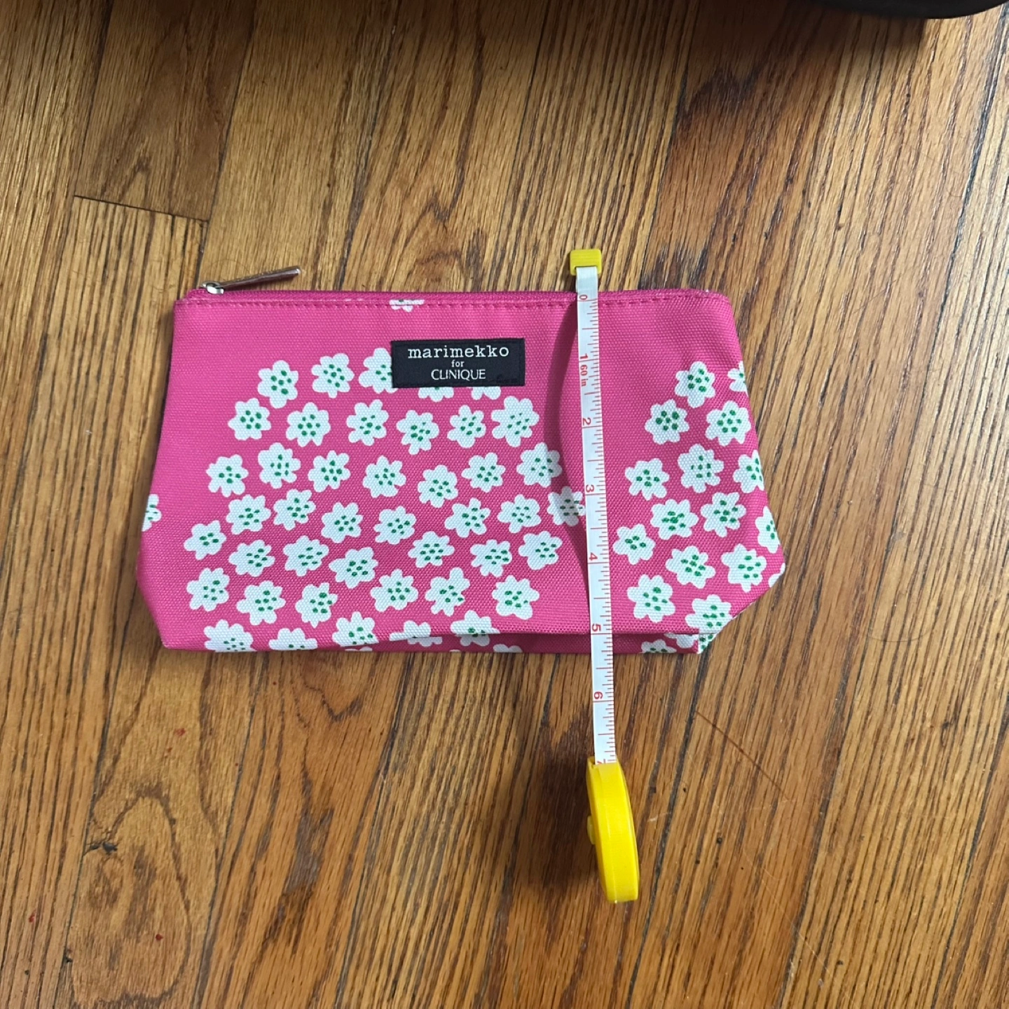 This is a cute Marimekko for Clinique pink pouch with a floral pattern! It measures approximately 7.5 inches in length and 4.5 inches in height. Perfect for storing your makeup or other small items