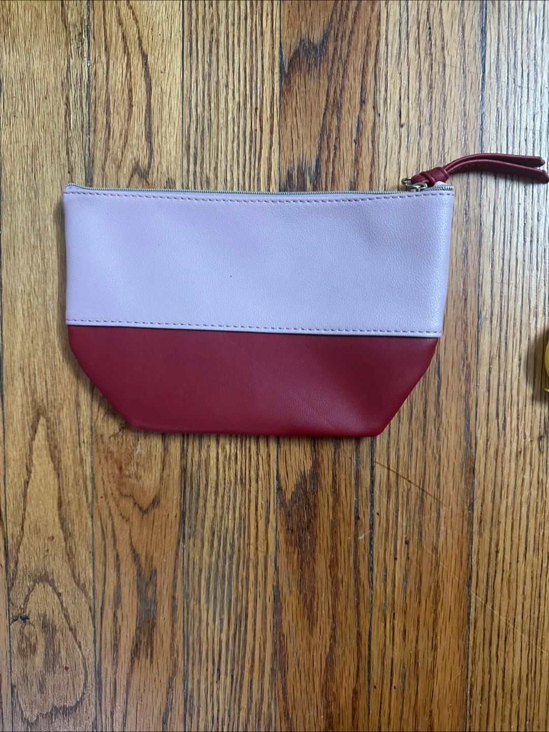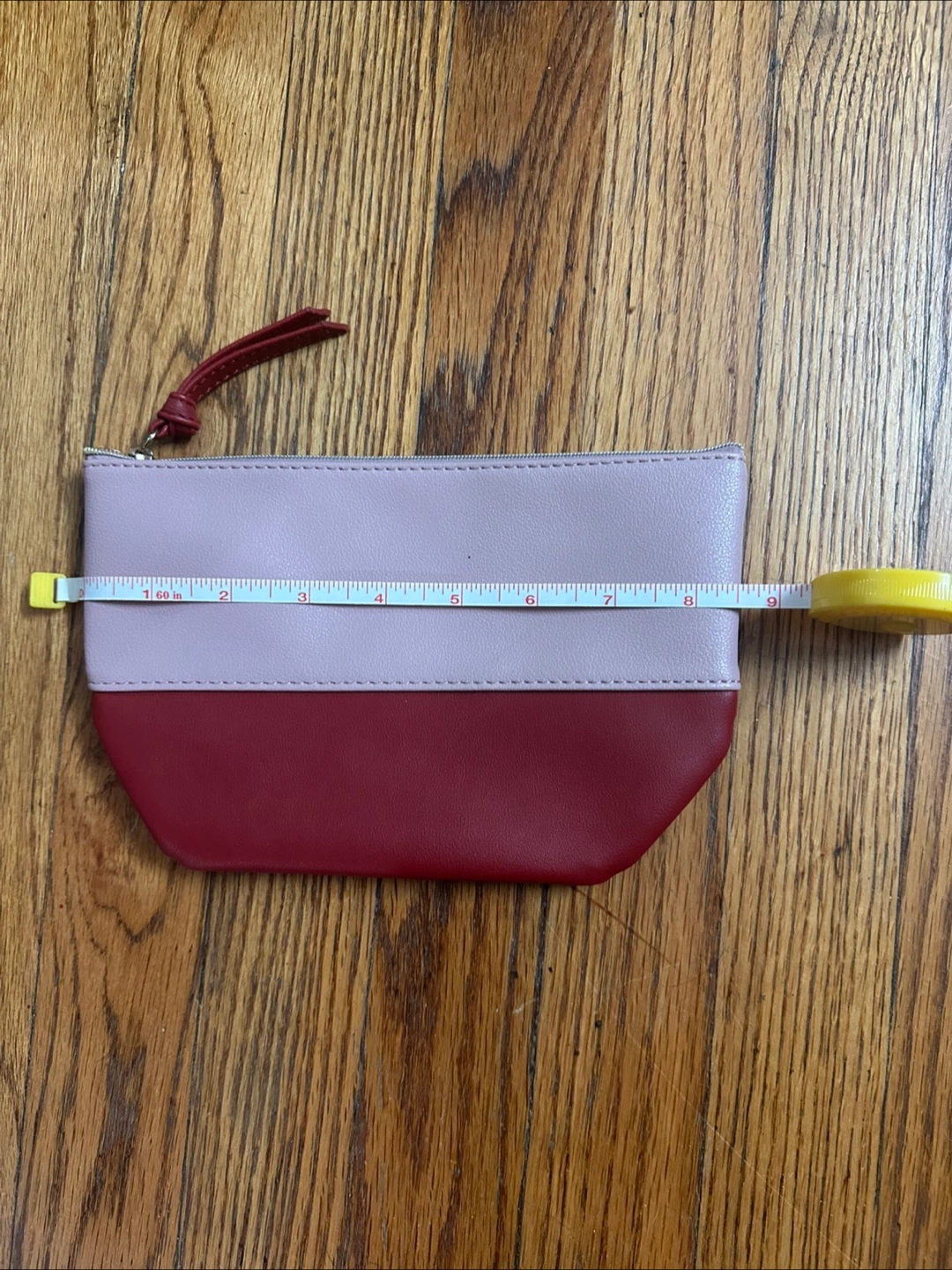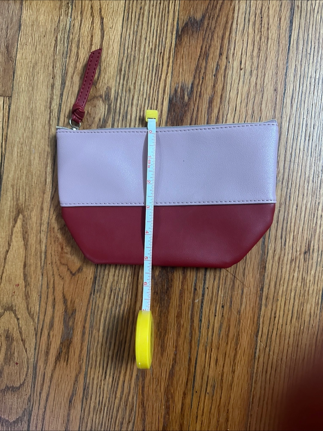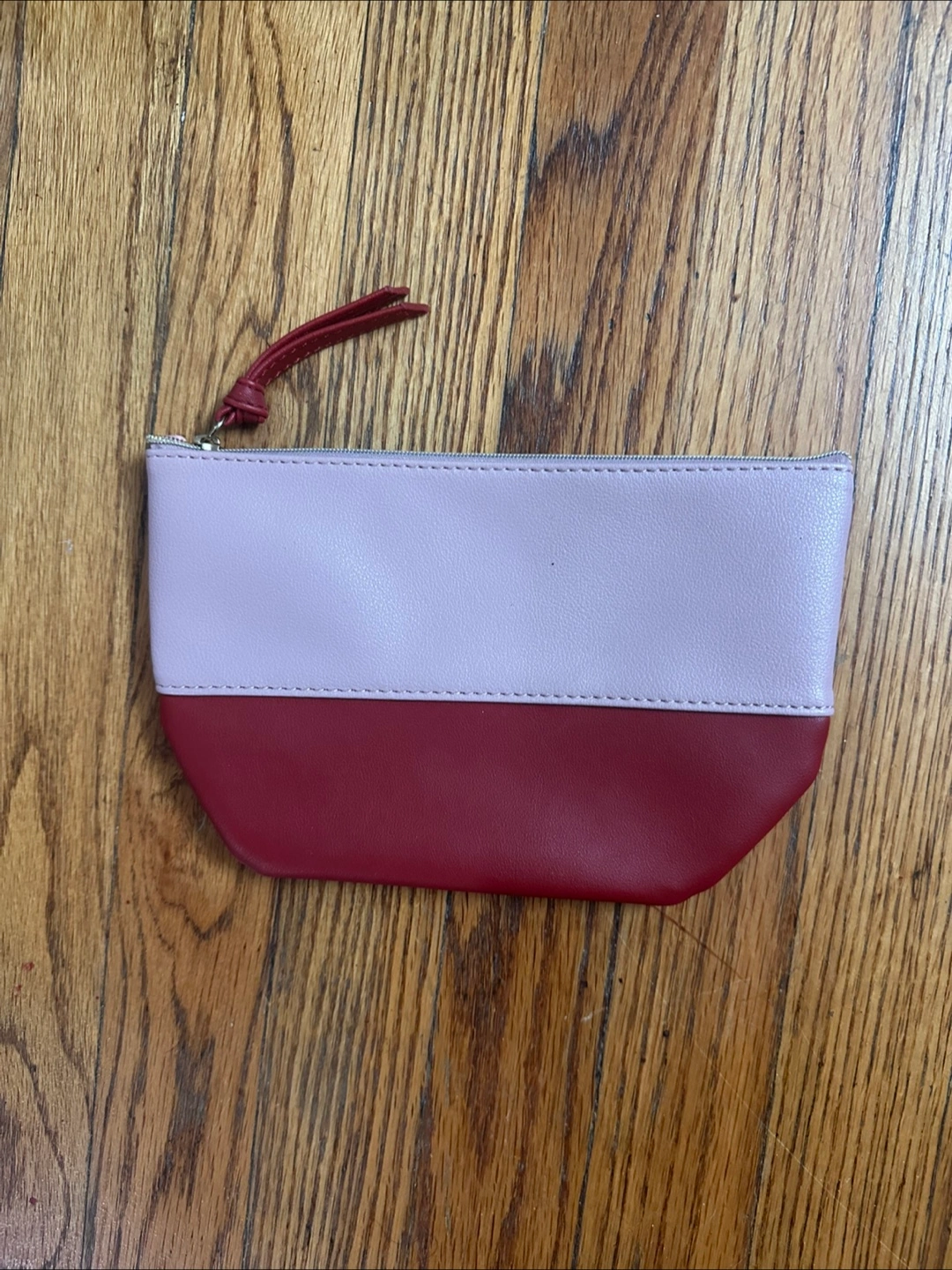 I'm selling a cute two-tone cosmetic bag! It's in great condition and ready for a new home. The bag features a stylish color block design with a light pink top and a burgundy bottom. It measures approximately 8 inches wide and 5.5 inches tall, perfect for holding your makeup essentials or toiletries