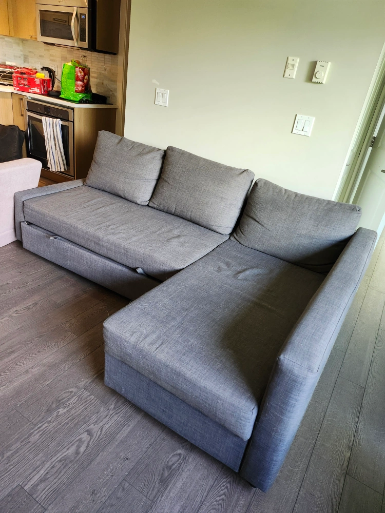 Comfy grey Ikea Friehten sofa bed. It's sun-faded and covered in dog hair but still has a lot of life left in it if those things don't matter to you. Couch is currently disassembled and ready for pick-up.