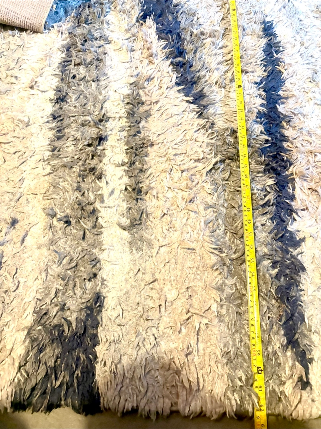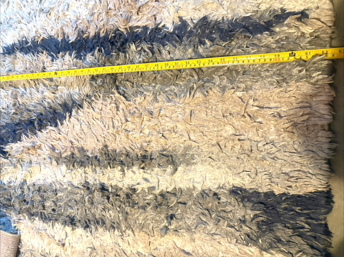Rug that would look great in any room! It features a striped pattern in shades of grey,blue and white. The rug is approximately 62(width) inches by 90 inches.(length)