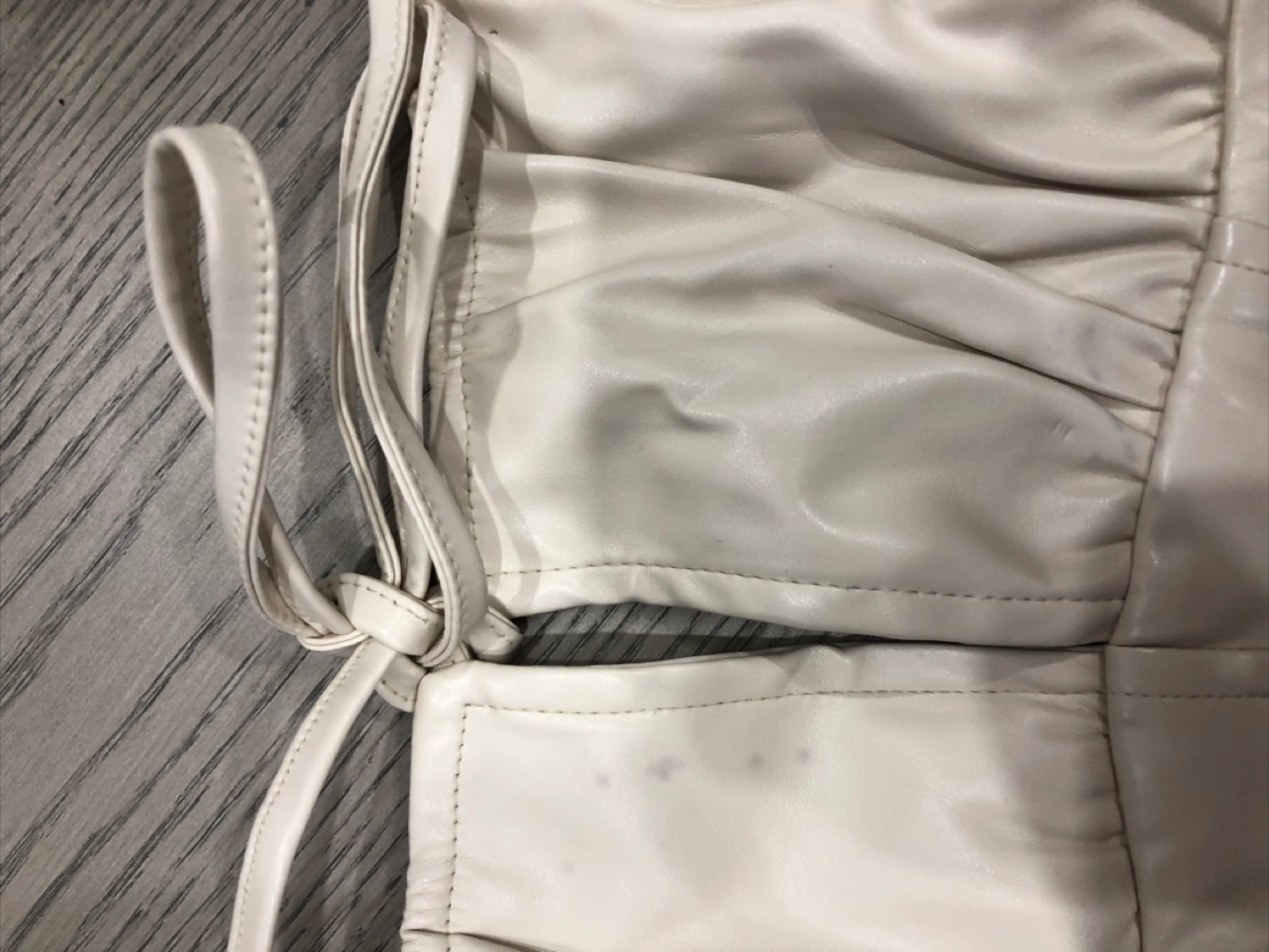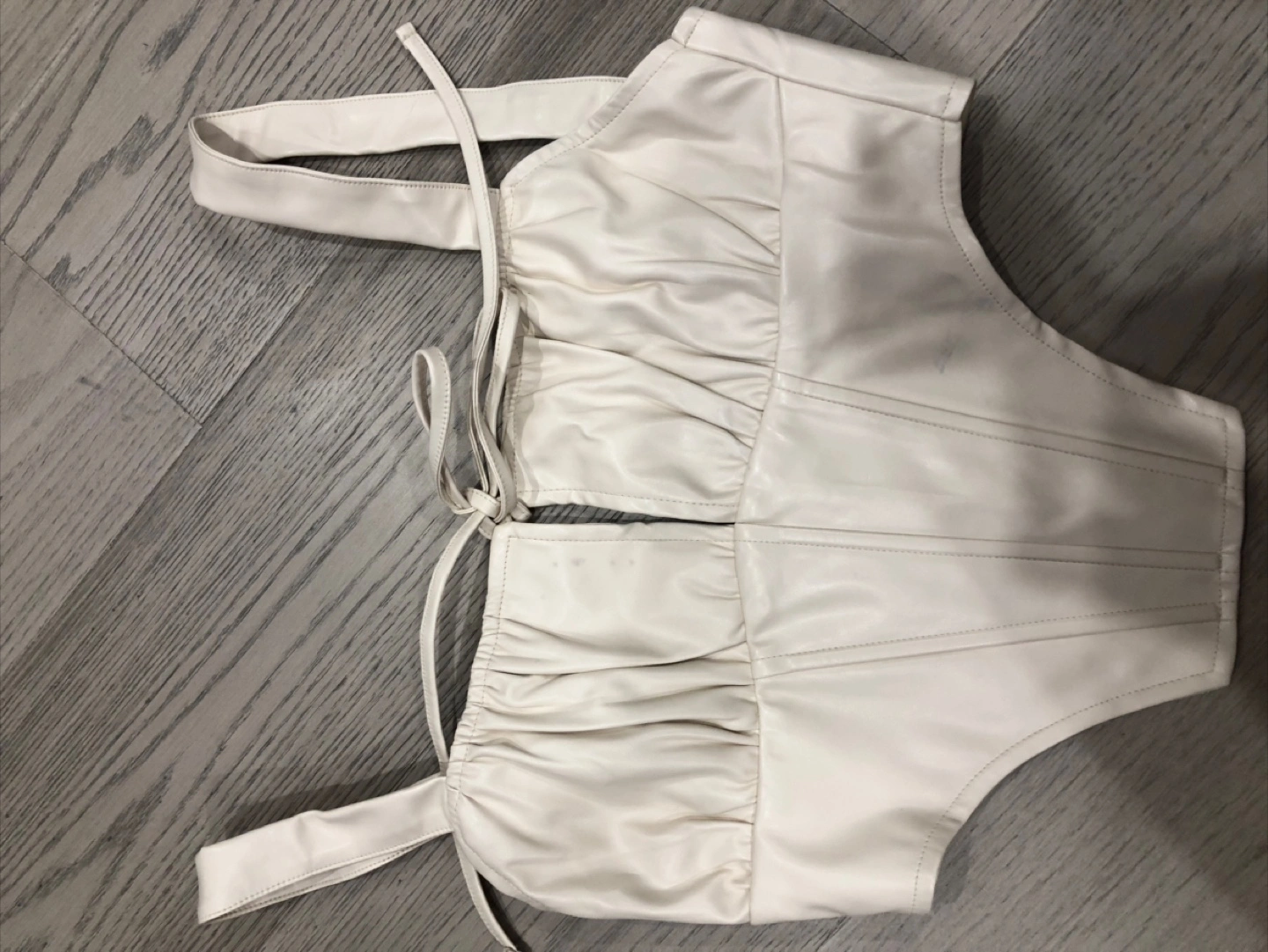 Selling a cute white faux leather corset top! It has a tie-up design and is in good condition. There are a few minor marks on the front as pictured.
