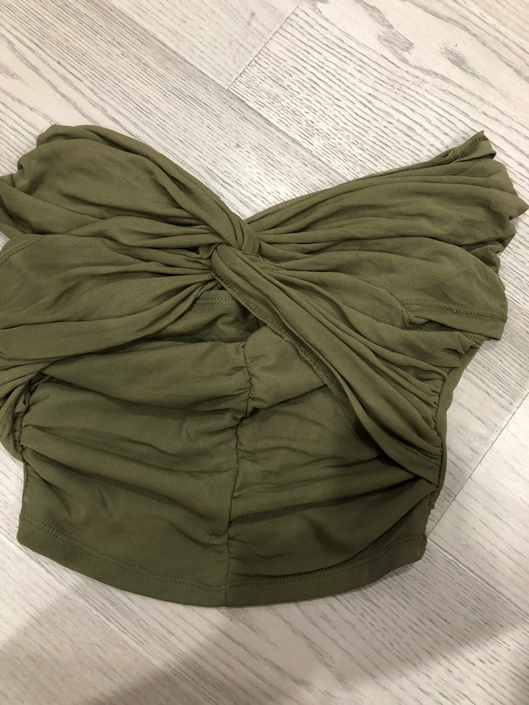 This is a cute olive green tube top! It's in great condition and would be a great addition to your wardrobe. It has a unique twisted design in the front.