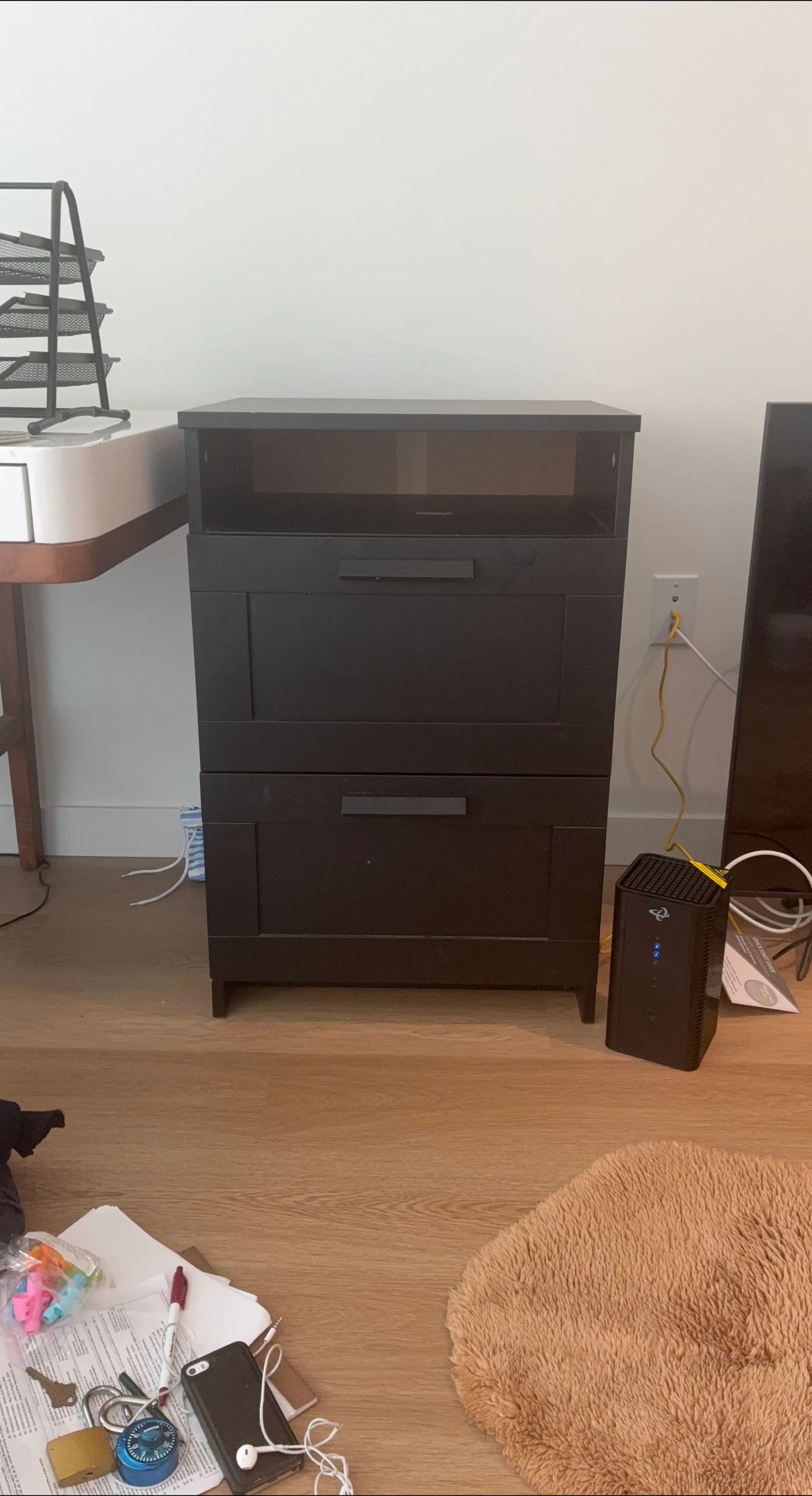 Selling a used IKEA Malm bedside table in black-brown. It features two drawers for storage and a clean, simple design that fits well in any bedroom. $30 OBO