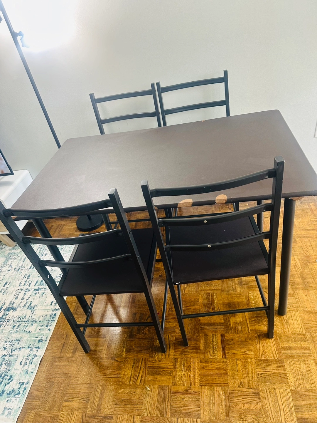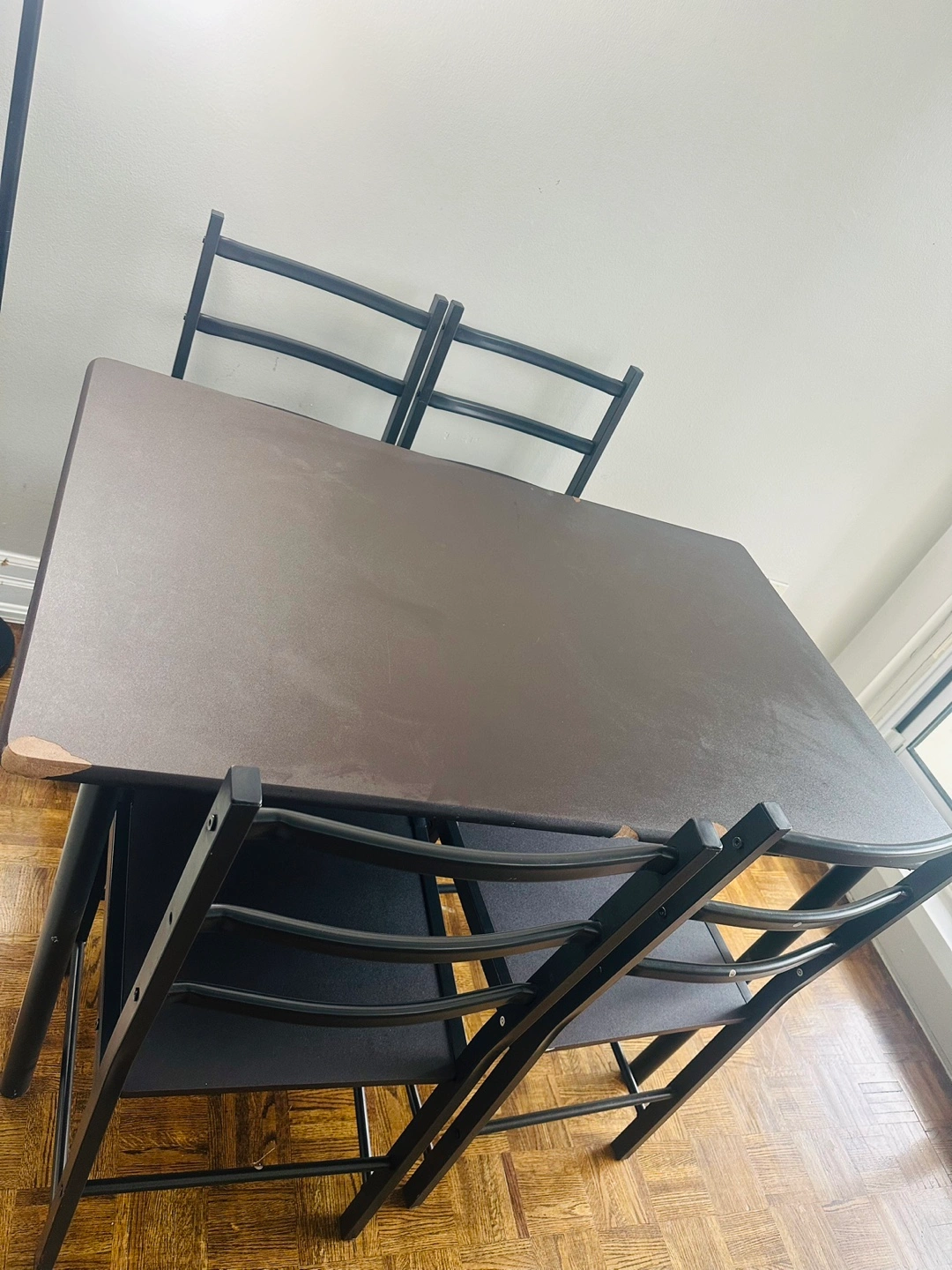 Selling a dining table with four chairs. It's a great set for a small space or apartment. The table is a dark brown colour, and the chairs have black frames with matching dark seats. It has some signs of use, but still in good condition