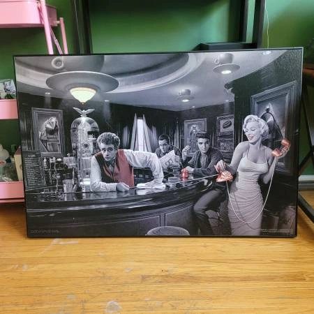 Selling a black and white print featuring James Dean, Marilyn Monroe, and Elvis Presley at a bar. It's a cool piece of art!