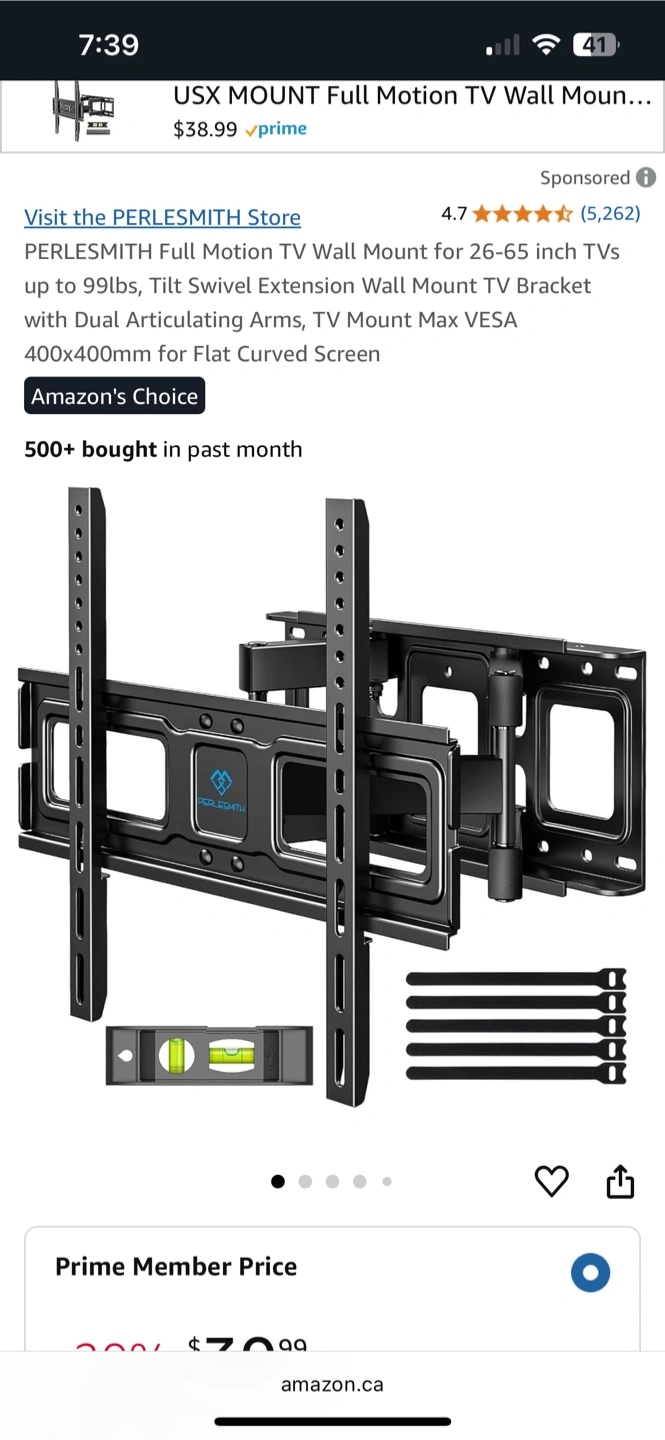 142Selling a PERLESMITH full-motion TV wall mount, still in its original box! It's designed for 26-65 inch TVs, supporting up to 99lbs. It features a tilt, swivel, and extension wall mount bracket with dual articulating arms and is compatible with TV Max VESA 400x400mm for flat and curved screens