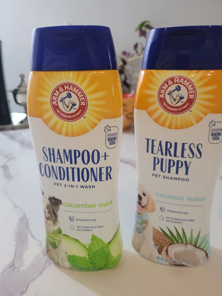 I'm selling two bottles of Arm & Hammer pet shampoo. One is a shampoo and conditioner combo with a cucumber mint scent, and the other is a tearless puppy shampoo with a coconut water scent! Both bottles contain 20 fl oz / 591 ml and are pH balanced for dogs, free of sodium lauryl sulfate, dyes, and parabens.