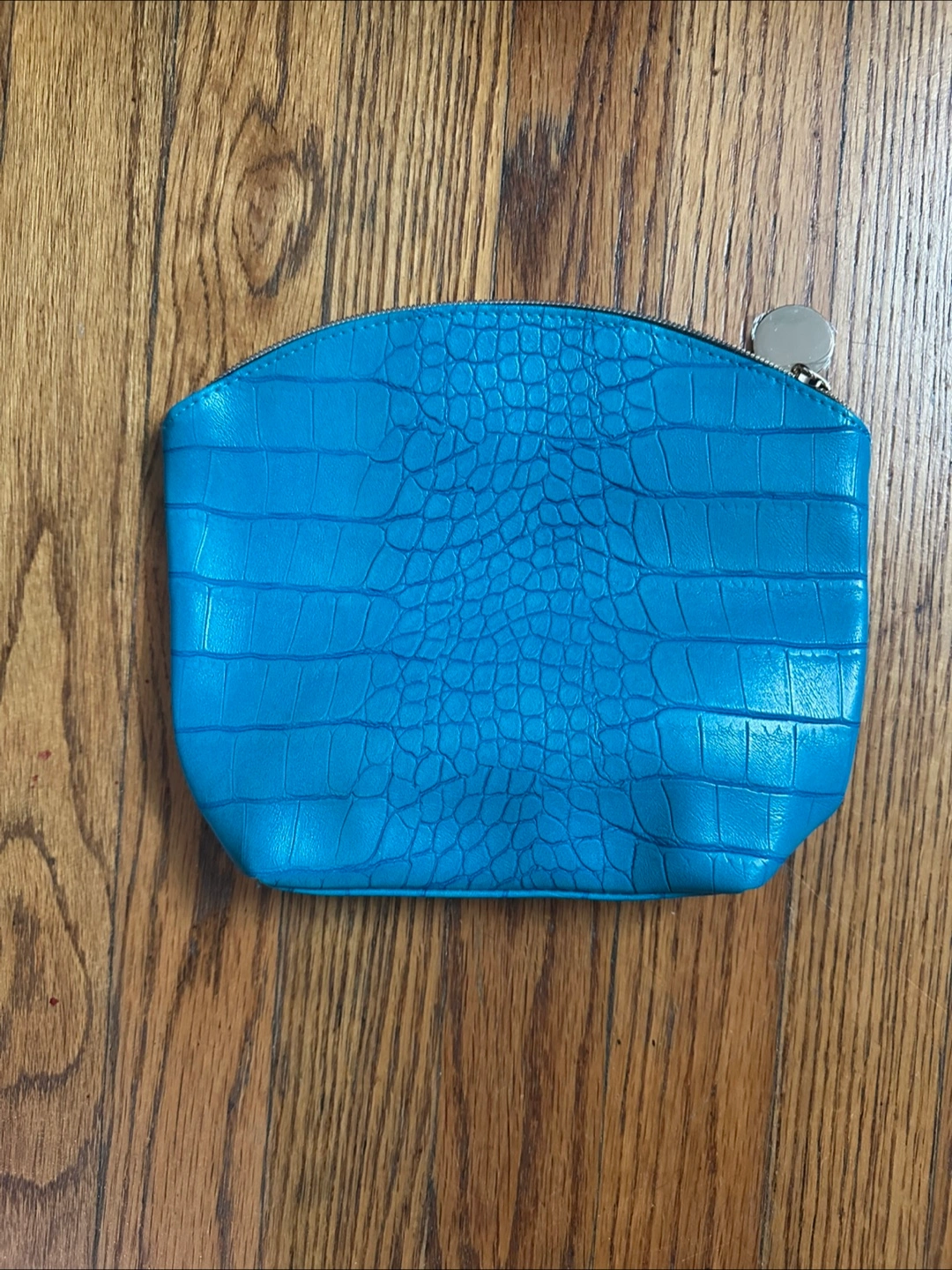Here's a cute blue cosmetic bag with a croc pattern! It measures about 10 inches wide and 8 inches tall. Perfect for keeping your makeup organized!