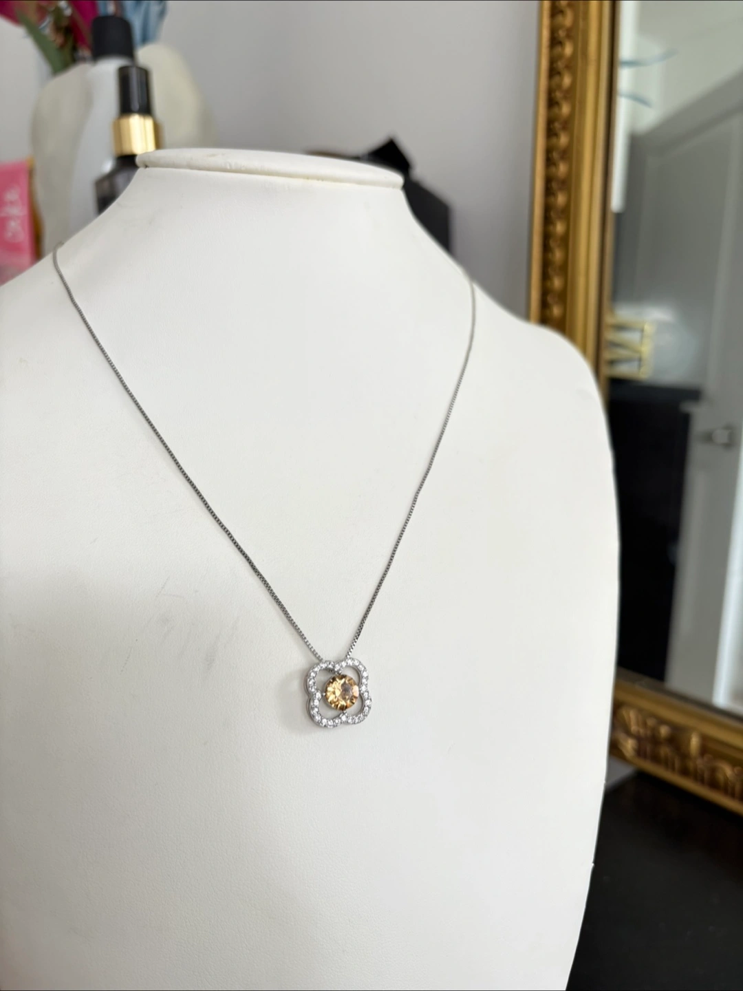 Selling a lovely necklace featuring a unique yellow stone pendant. The pendant is surrounded by smaller, clear stones. It's in great condition
