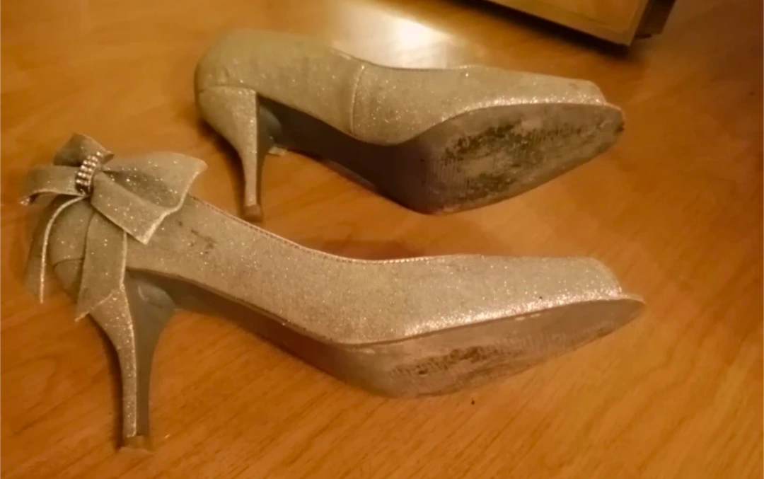 These are a beautiful pair of silver glitter 2.5inch heels that feature a peep toe and a cute bow on the back. They are size 38 or 7. Lots of wear left in them.