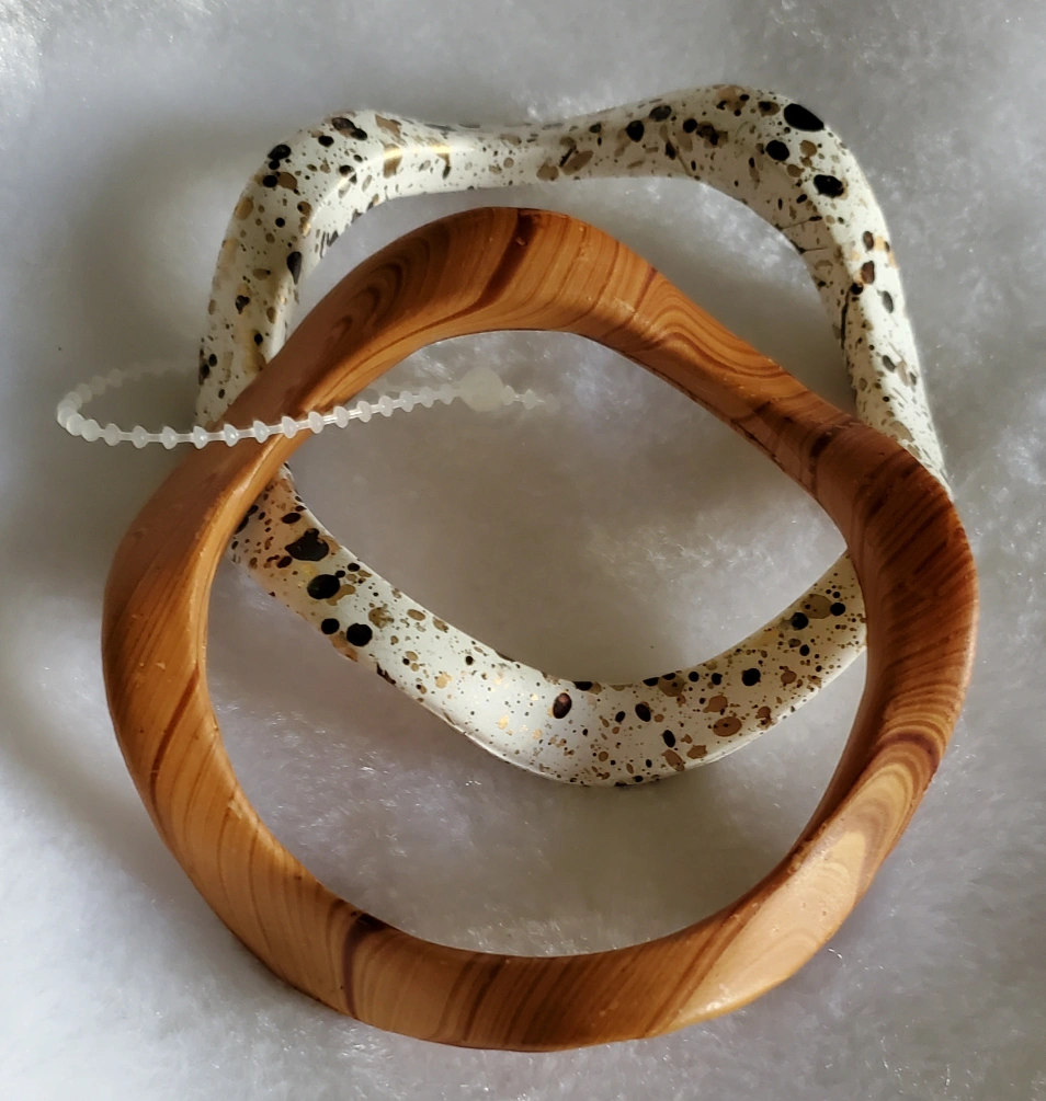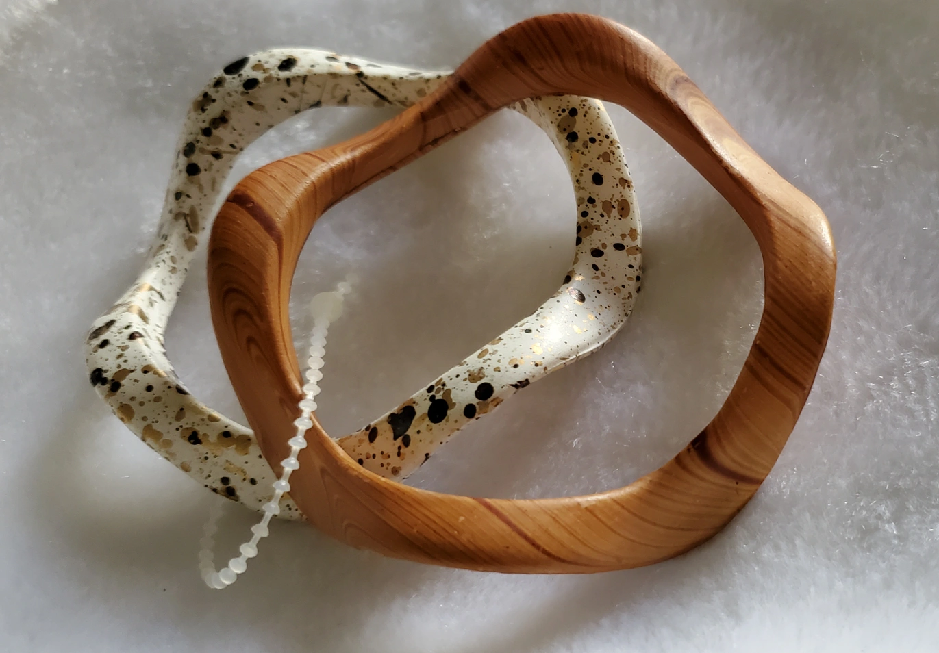Here's a set of two unique bangle bracelets! One is made of wood and the other is painted with a speckled design. They're a stylish and fun addition to any outfit.