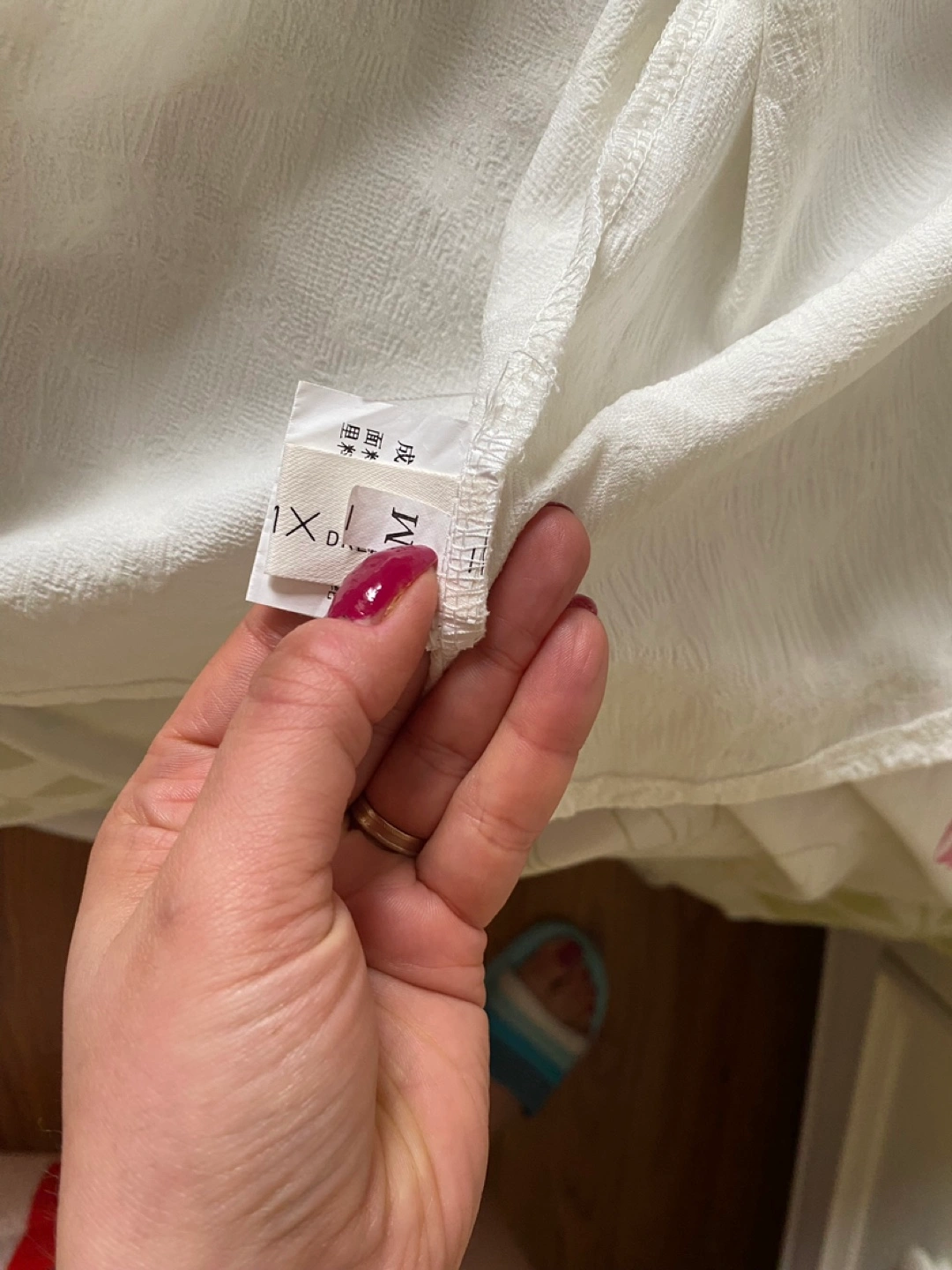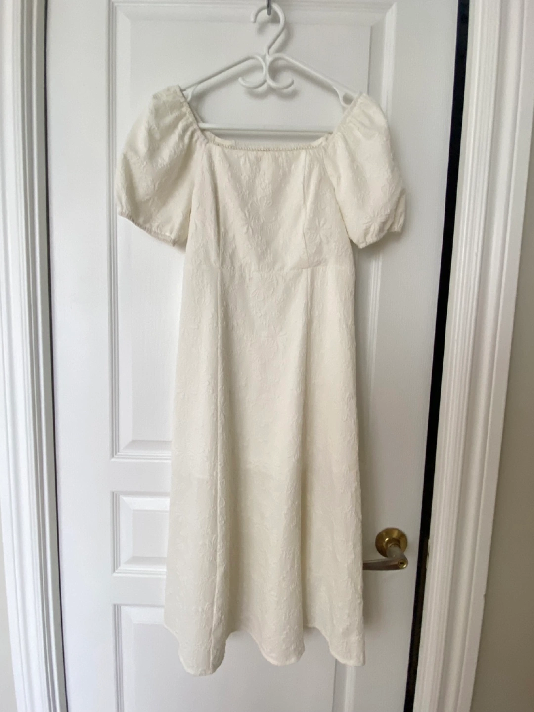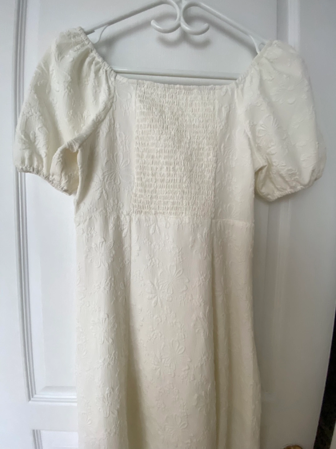 Selling a lovely white dress with a subtle floral pattern. It features short, puffed sleeves and a flattering square neckline, designed with small pearls. The dress has a comfortable, flowy fit and a stylish slit at the bottom. Perfect for a summer day out or a special occasion