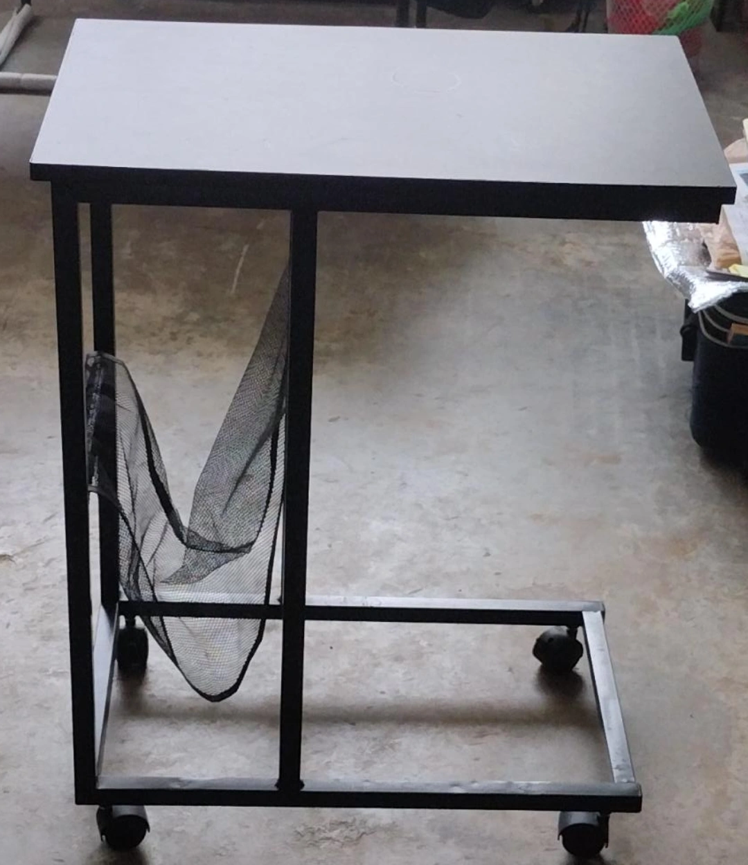 This black rolling side table is perfect for small spaces! It features a convenient magazine holder on the side and rolling wheels for movement around your home. One wheel is wobbly, so open to offers.