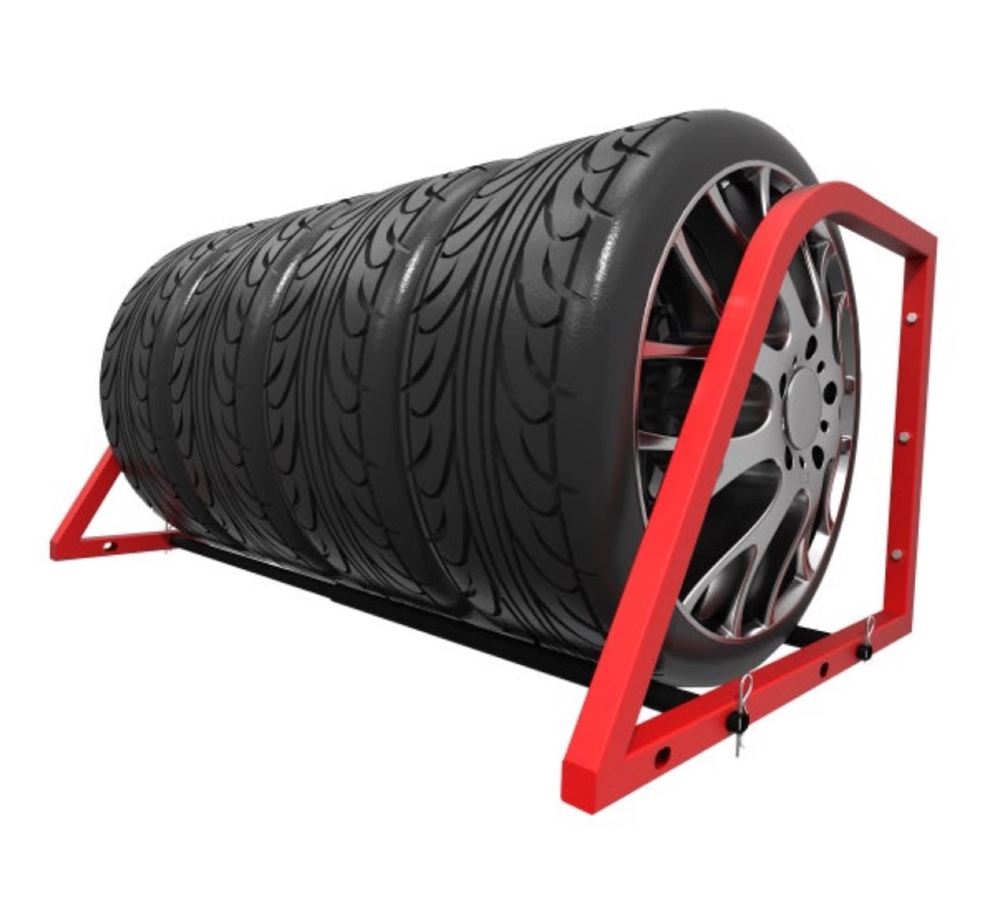 A heavy duty steel wall-mounted tire rack in red! It's a great way to keep your winter or all-season tires organized and off the floor in your garage or storage space.