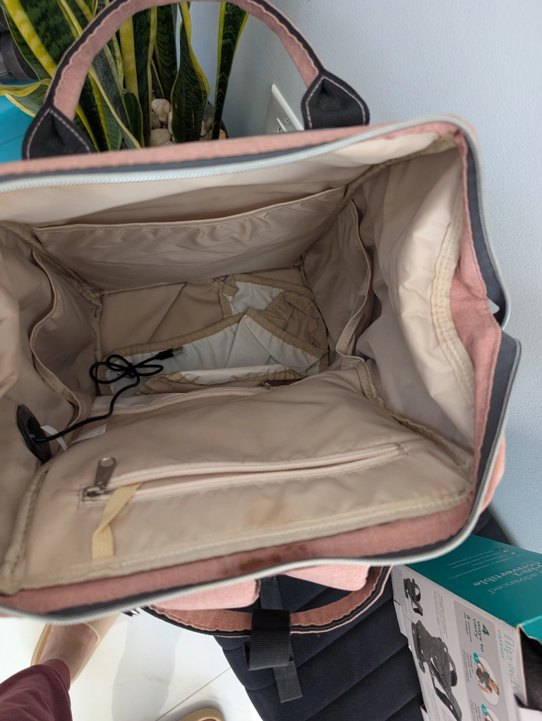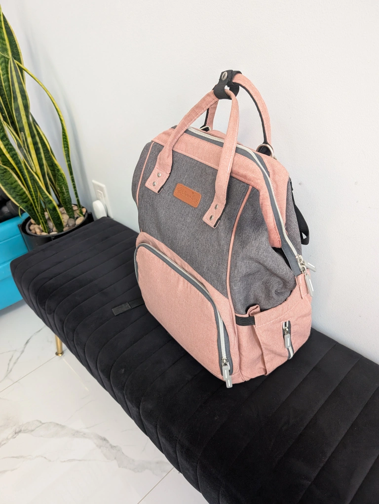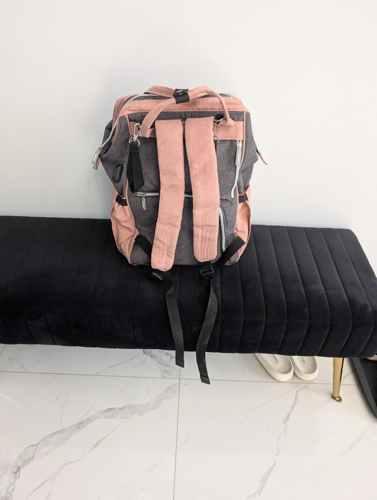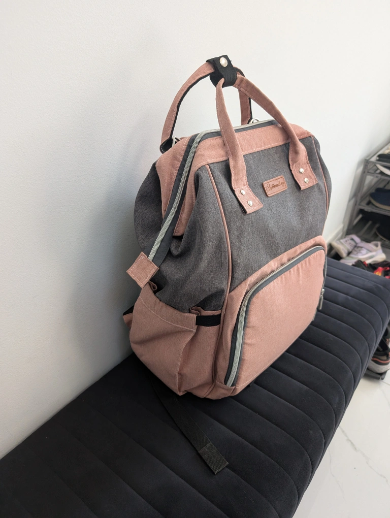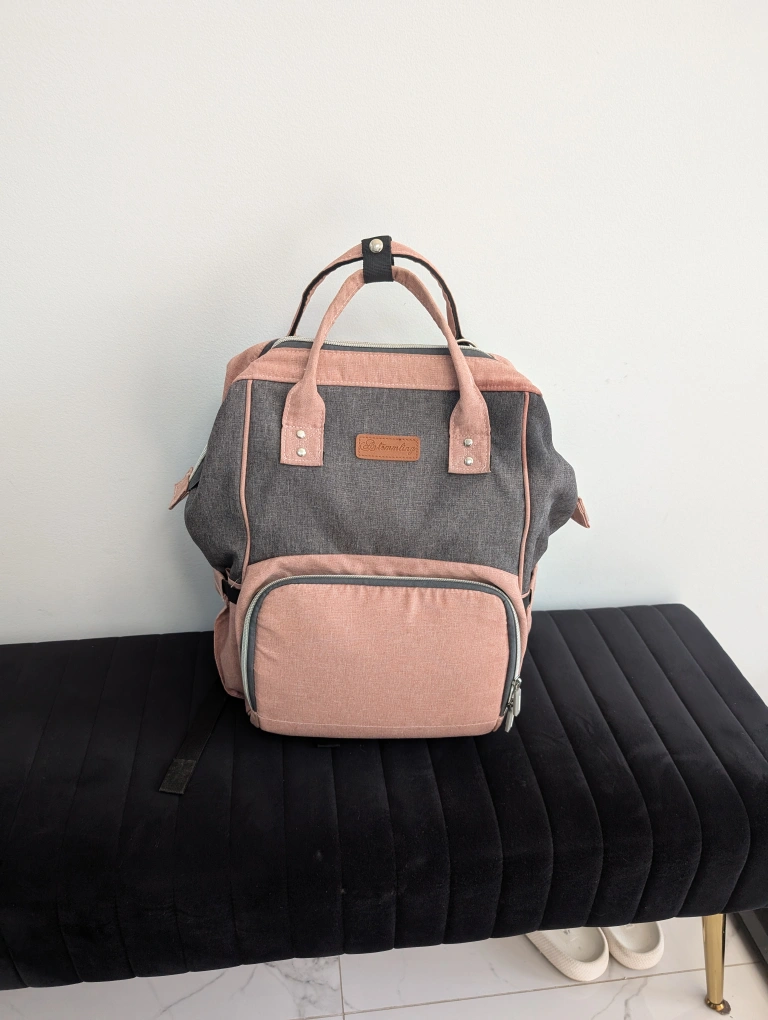 Looking to sell this diaper backpack in a lovely pink and grey colour combo! It's in great condition and ready for a new home. Perfect for keeping all your baby essentials organized while you're on the go