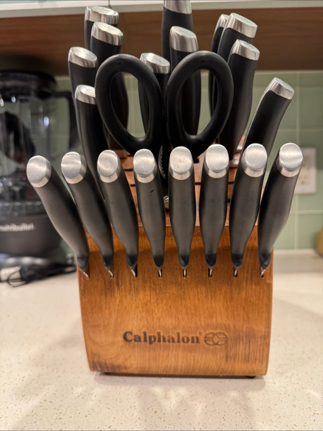Calphalon 20 piece knife block set! It includes a variety of knives for all your cutting needs. The set features knives labeled with their size and purpose, such as an 8" chef's knife, 7" santoku, 8" bread knife, and more. The block is made of wood and has the Calphalon logo on the front. I have a second set and don’t need two.
