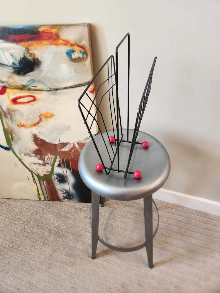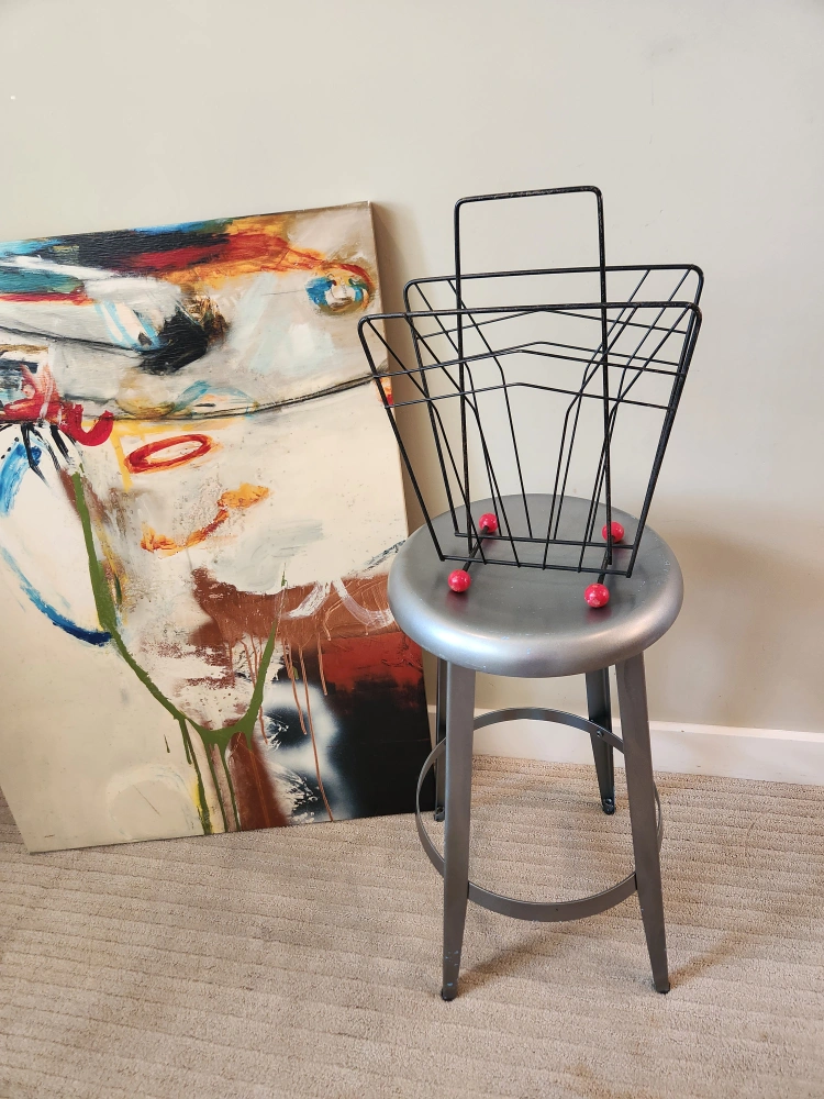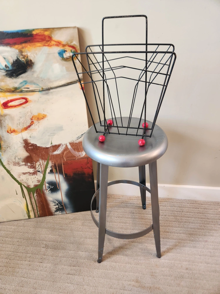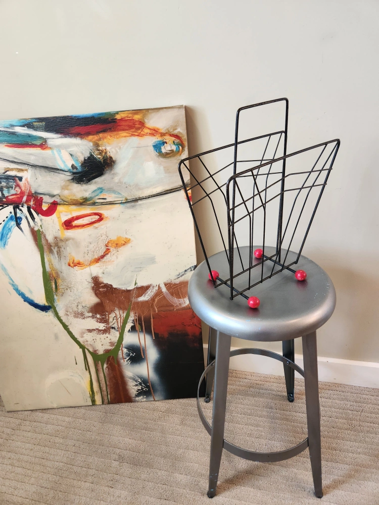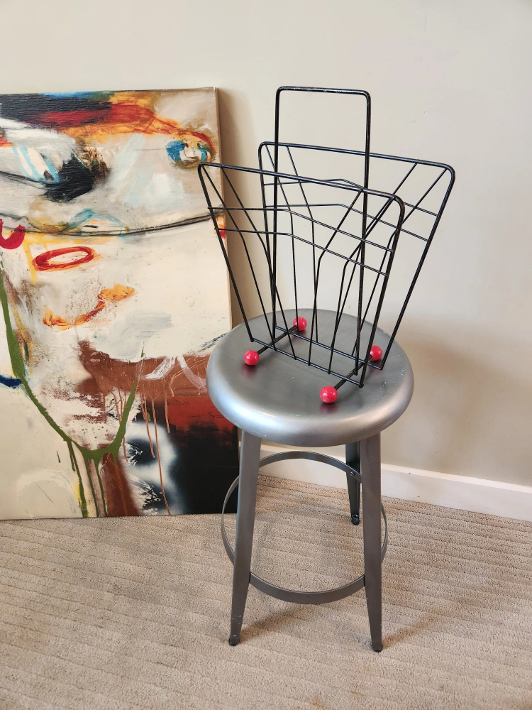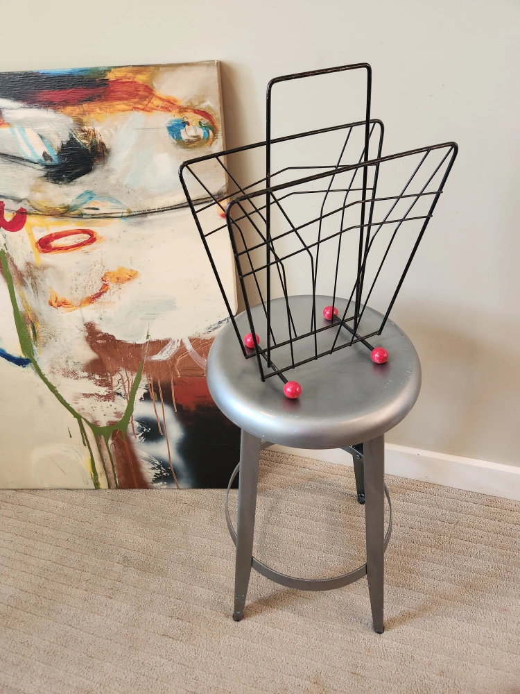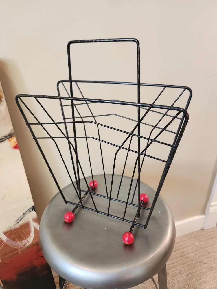 Here's a cool atomic style 1950'S magazine rack! It's made of black metal with red ball feet. It's perfect for holding magazines, books, or even records. It would look great in any room of your home. 12 inches wide x 5.5 deep x 16 inches high!