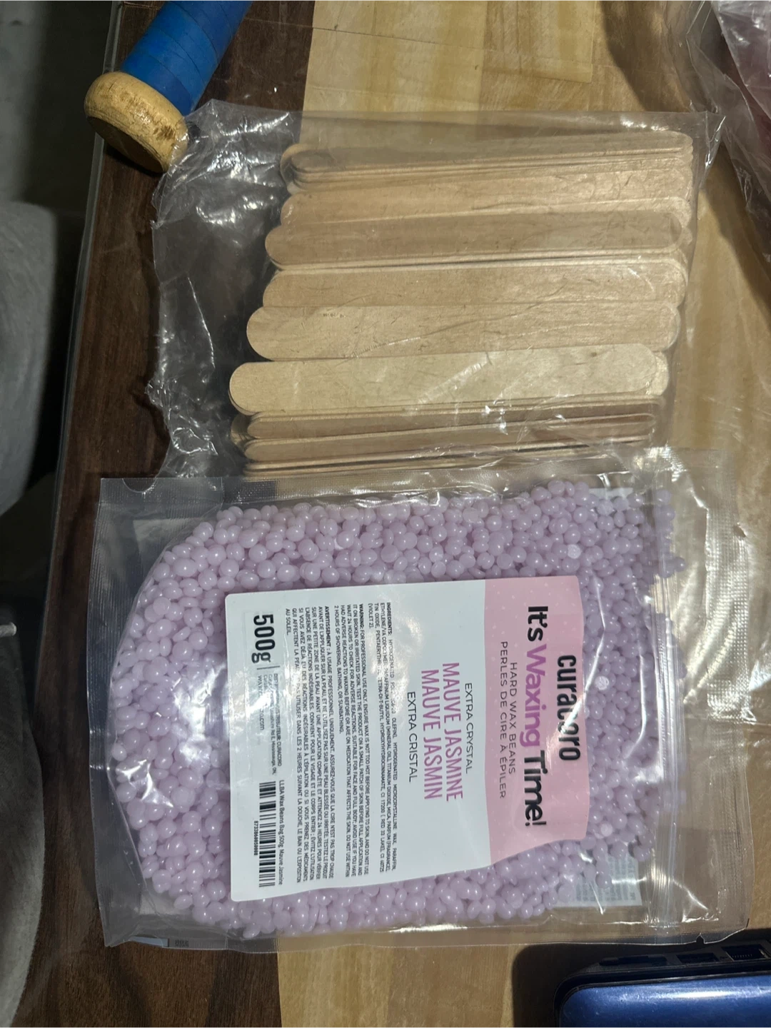 This is a 500g bag of It's Waxing Time! Curapro Mauve Jasmin hard wax beads, plus wooden applicator sticks. The wax is a "Mauve Jasmin" variety for extra crystal results. It's made in Italy. EXP: 02/2030.