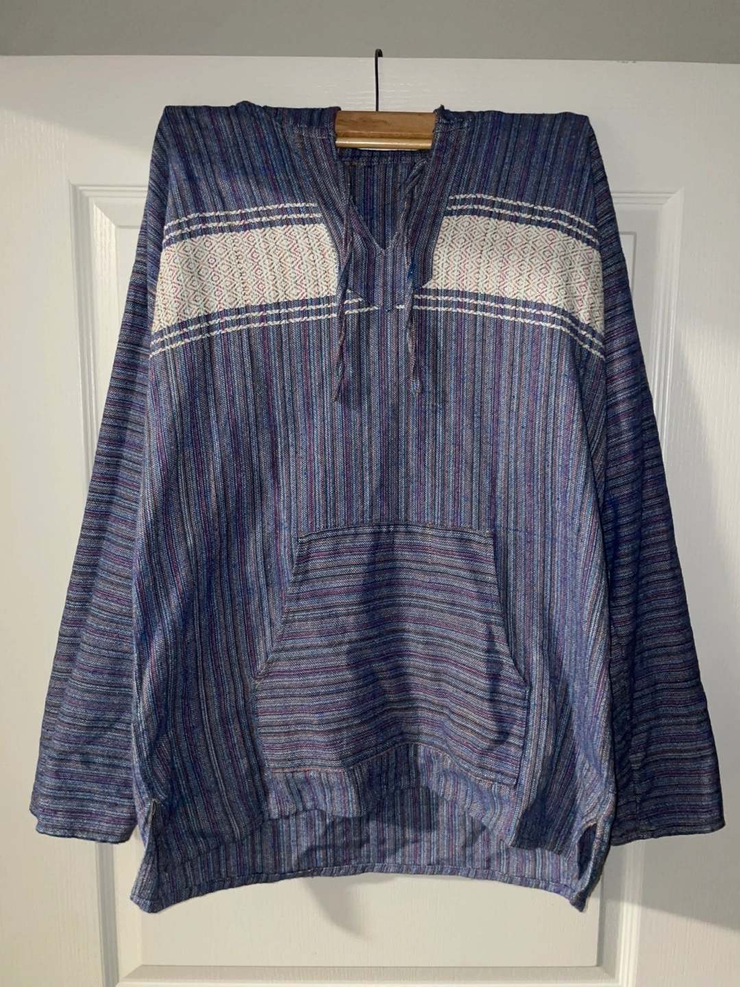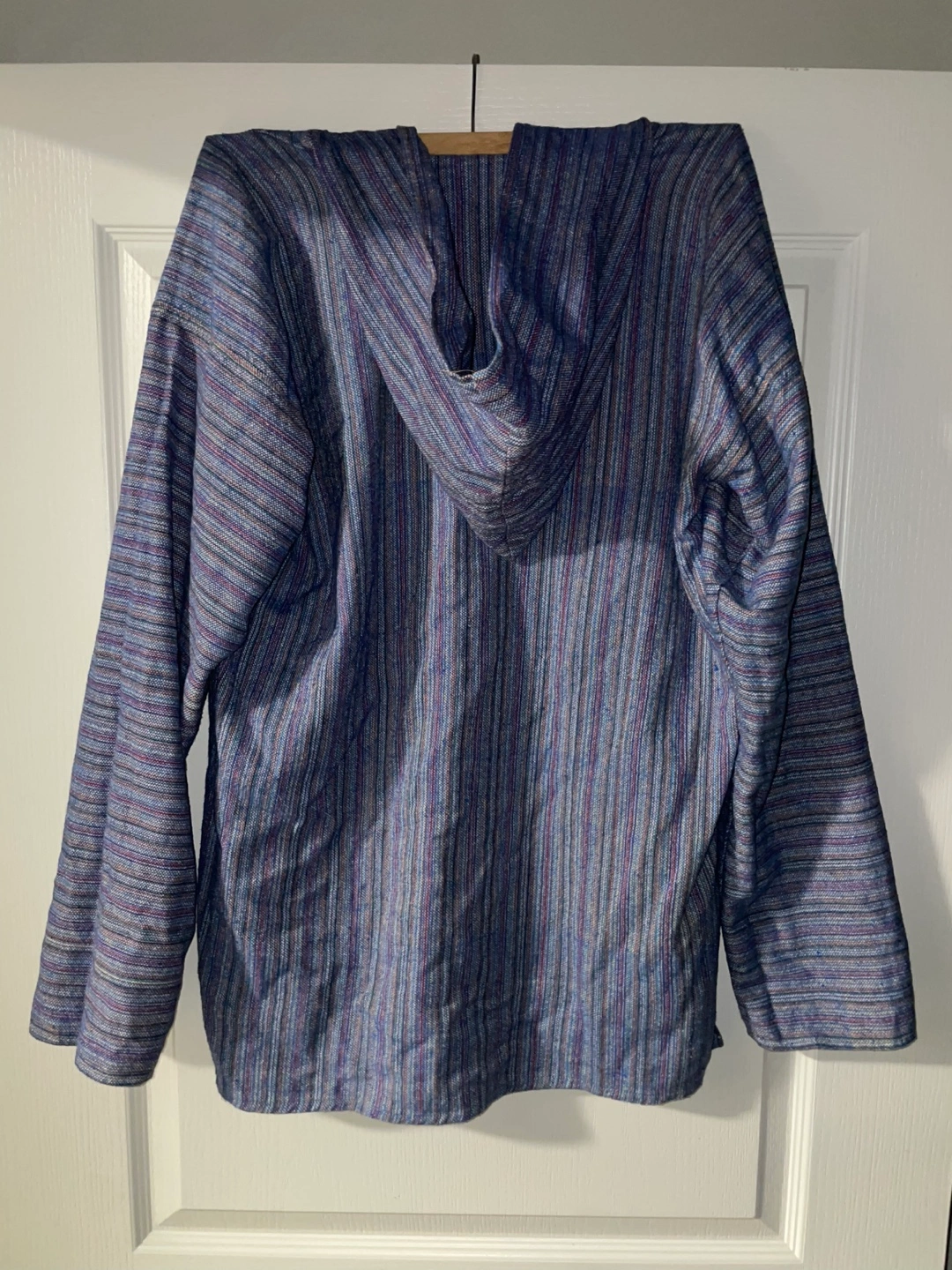 It's got a cool, relaxed vibe and is perfect for throwing on when you need an extra layer. The material feels soft and cozy, and it's in great shape!