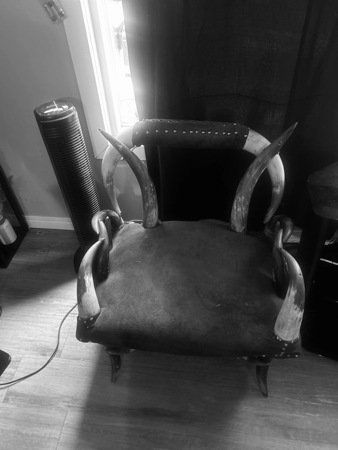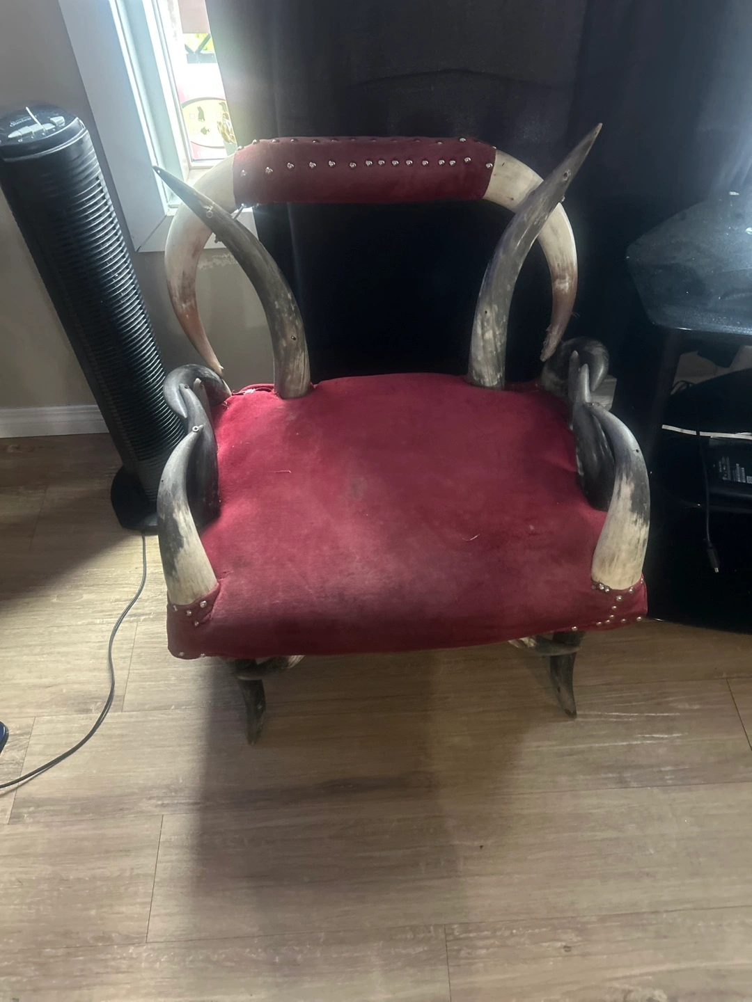 Selling a unique armchair with horn detailing! It's a real statement piece that would add character to any room. The seat is upholstered in a red velvet-like material, and the horns are securely attached. A truly one-of-a-kind find! $2500 obo