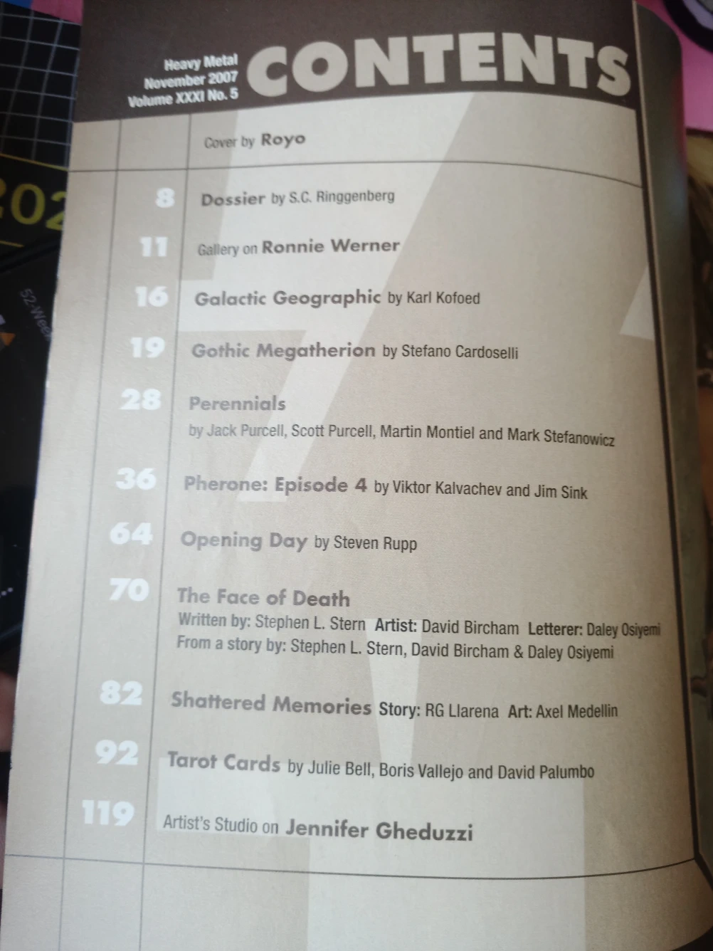Selling a copy of Heavy Metal Magazine from November 2007. It features cover art by Royo, and includes articles such as Dossier by S.C. Ringgenberg, a gallery on Ronnie Werner, and Gothic Megatherion by Stefano Cardoselli. There's also Pherone: Episode 4 by Viktor Kalvachev and Jim Sink, and Tarot Cards by Julie Bell, Boris Vallejo and David Palumbo