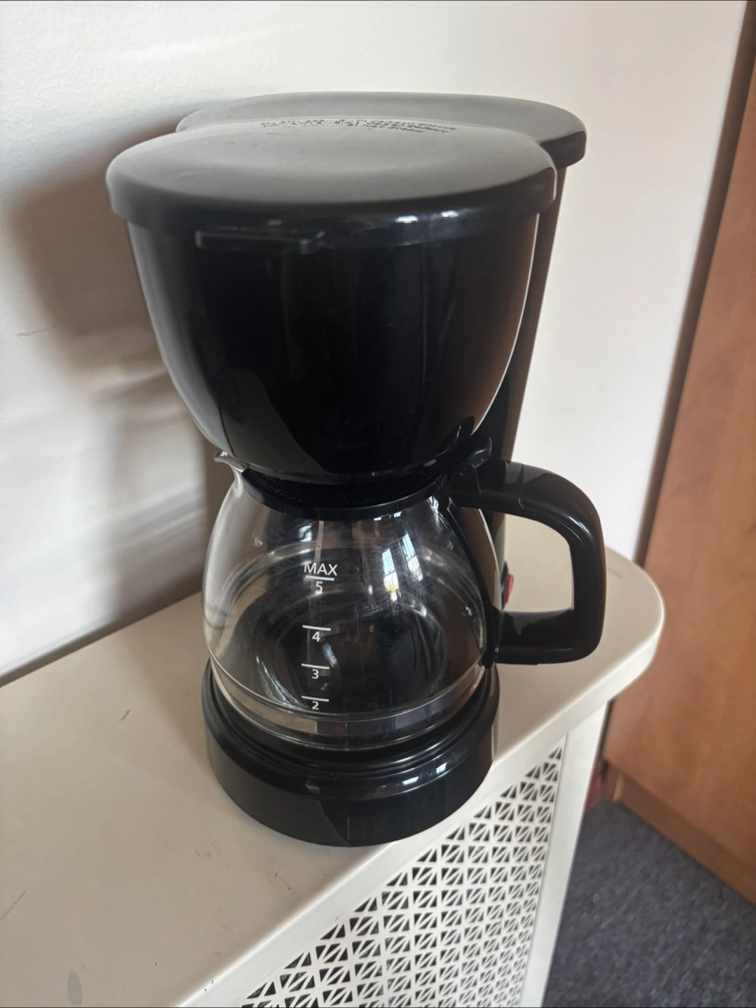 Selling a used black coffee maker in good condition. It has a glass carafe with measurement markings and a simple on/off switch. Perfect for brewing your daily coffee!