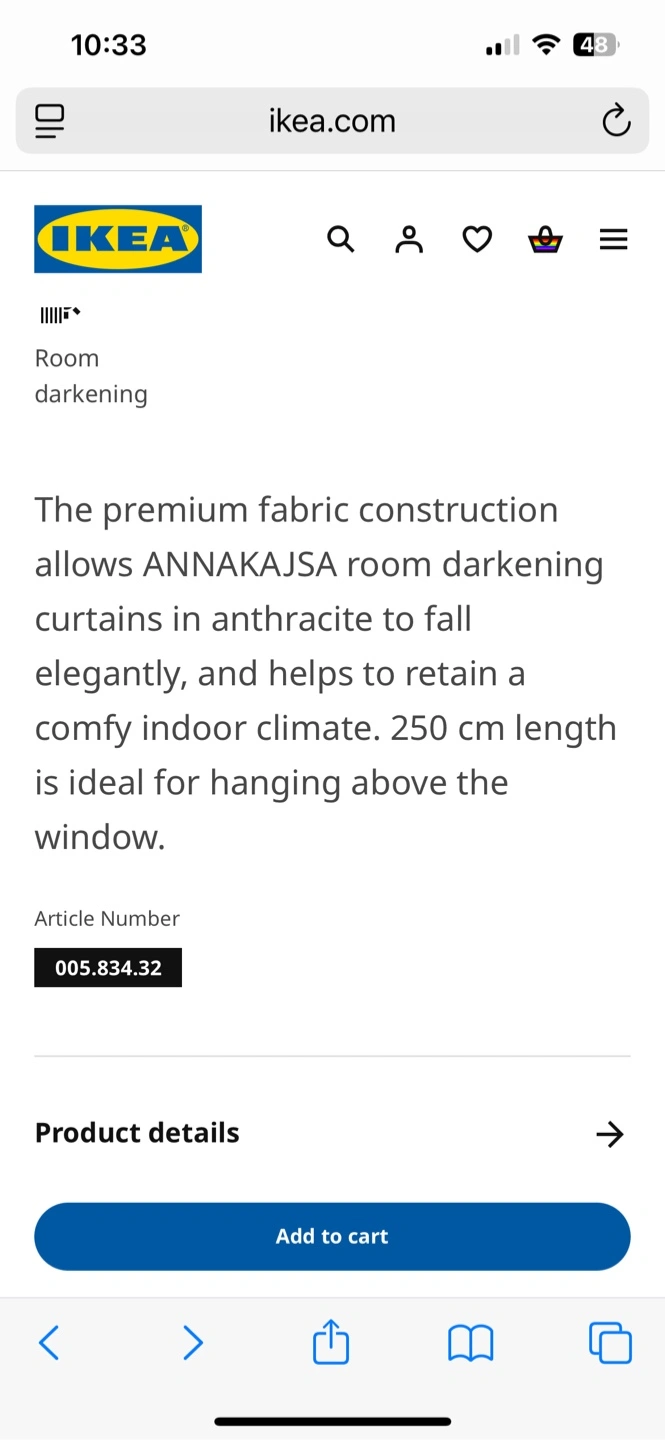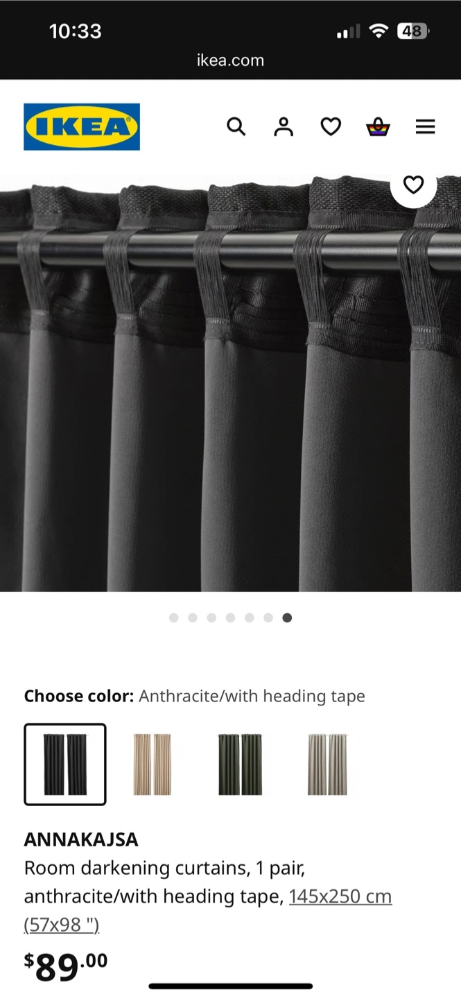 I'm selling a pair of IKEA ANNAKAJSA room-darkening curtains in anthracite. They're in great condition and ready to add a touch of elegance to your space! The size is 145x250 cm (57x98 ").