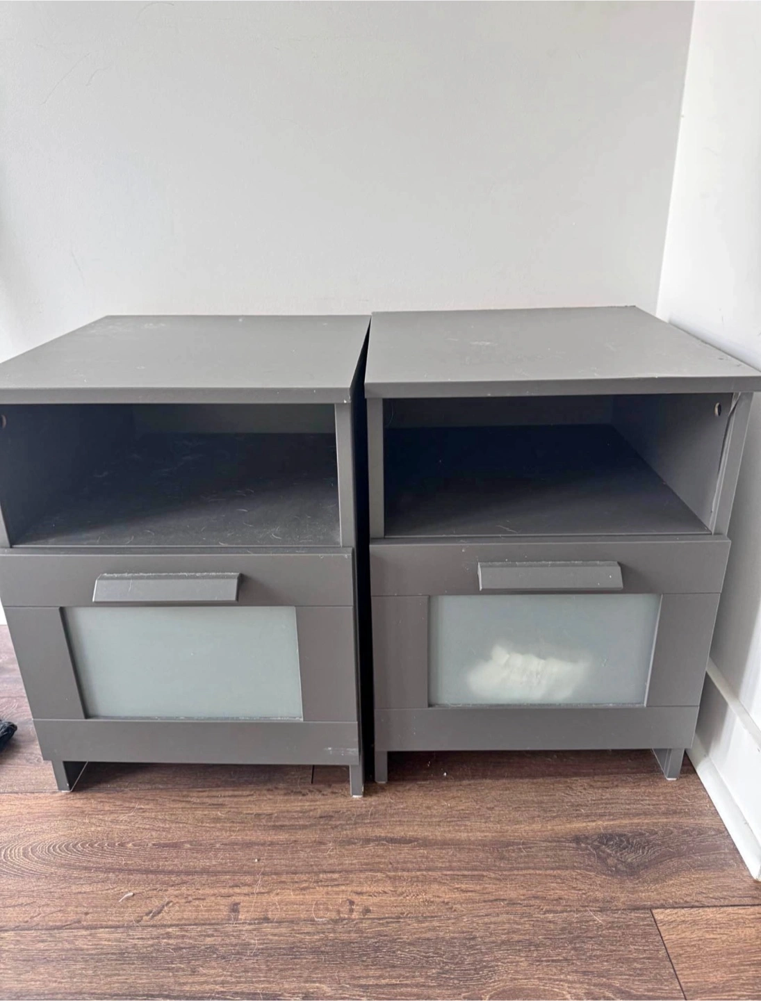 Selling a pair of Ikea brimness nightstands in grey. They have a drawer and an open shelf for storage. Perfect for a bedside table!