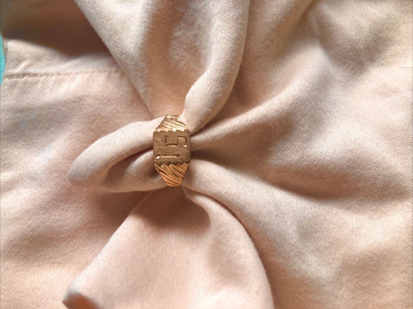 pure 14 k gold signet ring. the band is just a little bent but the signet is without flaw. Could read as 51, as 15, as SI or as IS.
