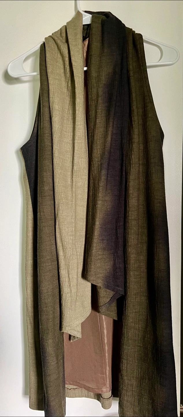 Selling a sleeveless olive green draped vest. It's in great condition and perfect for layering! The vest has a unique draped design.
