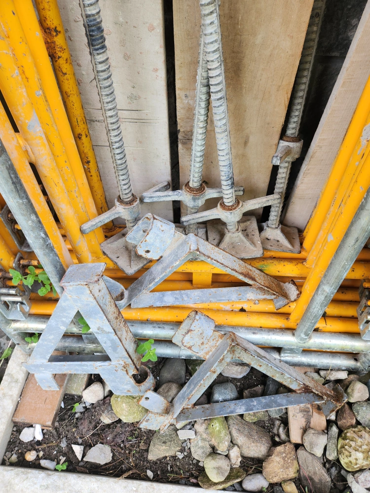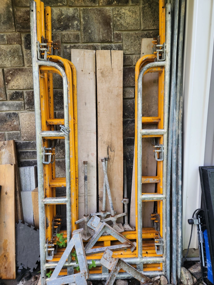 Selling a set of 6 used scaffolding frames and accessories. They are yellow metal and show signs of wear, but are still functional for your construction or DIY projects