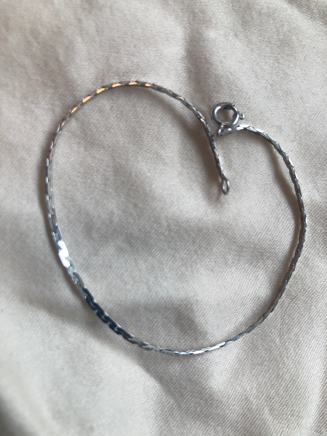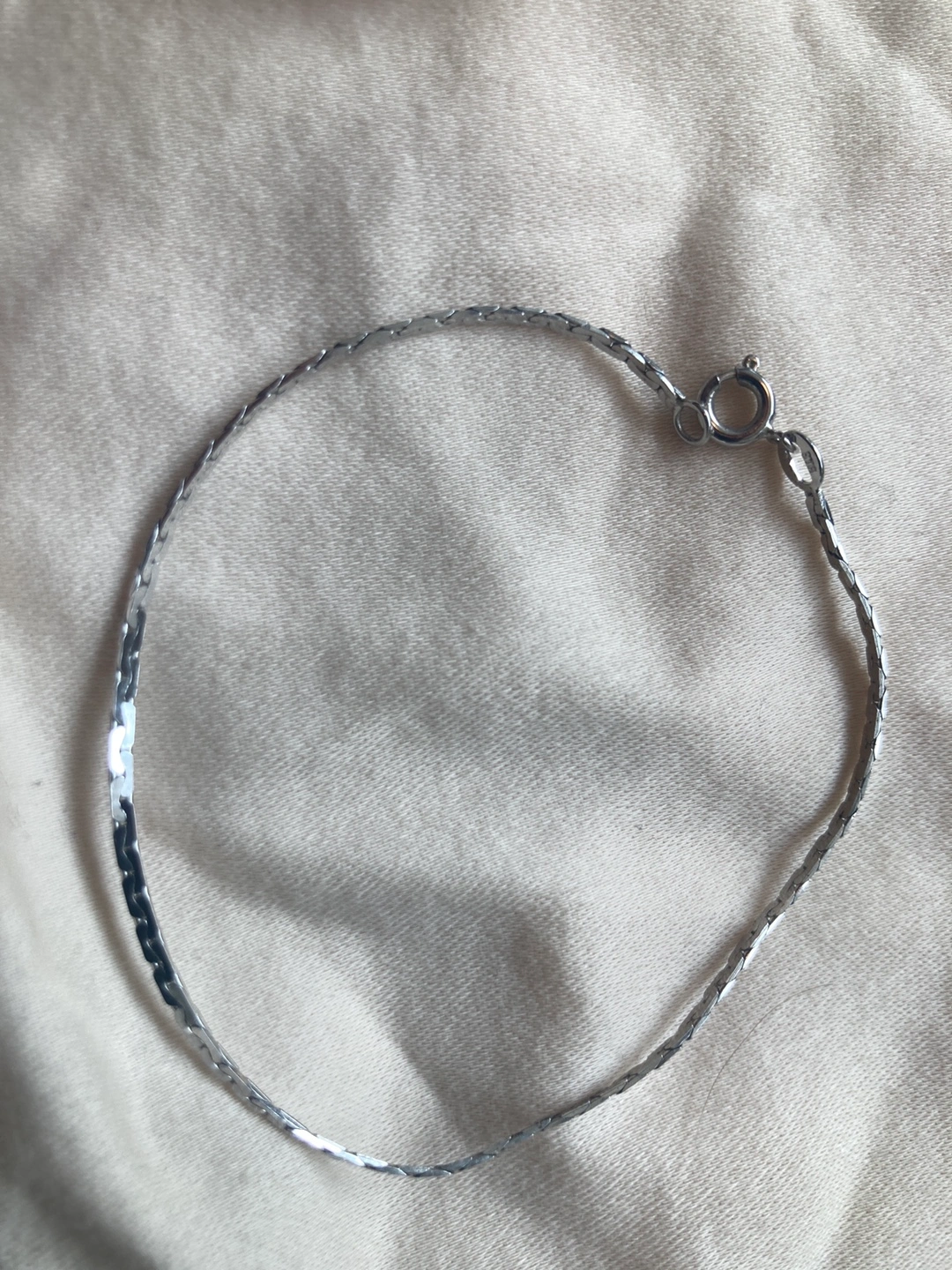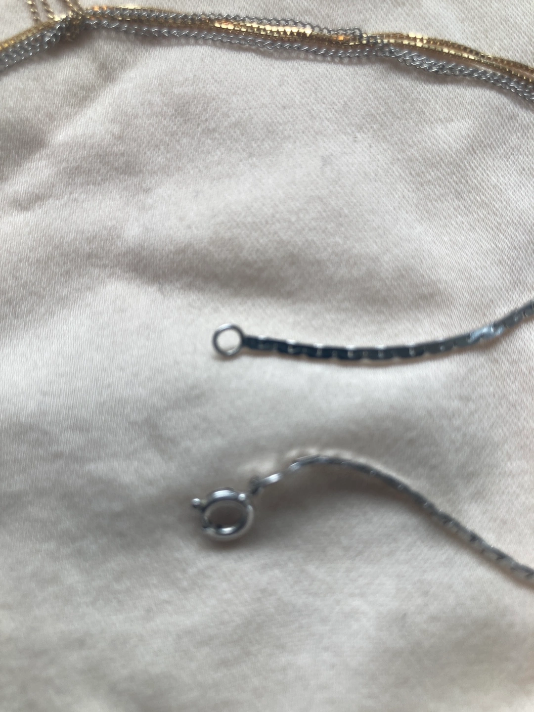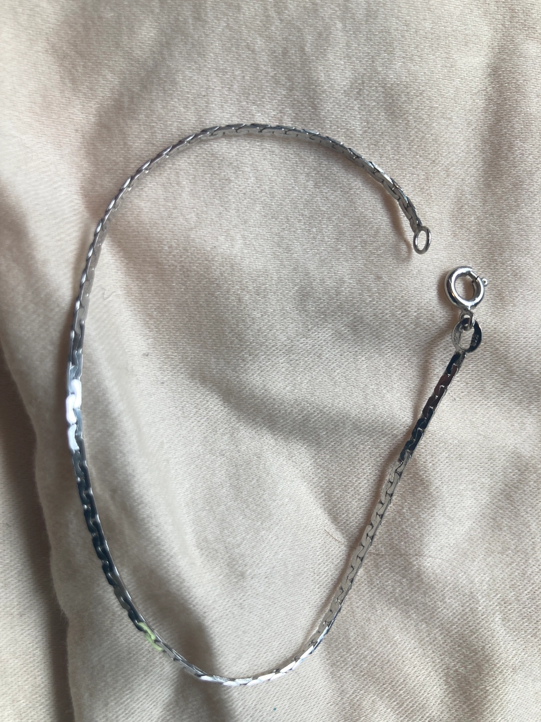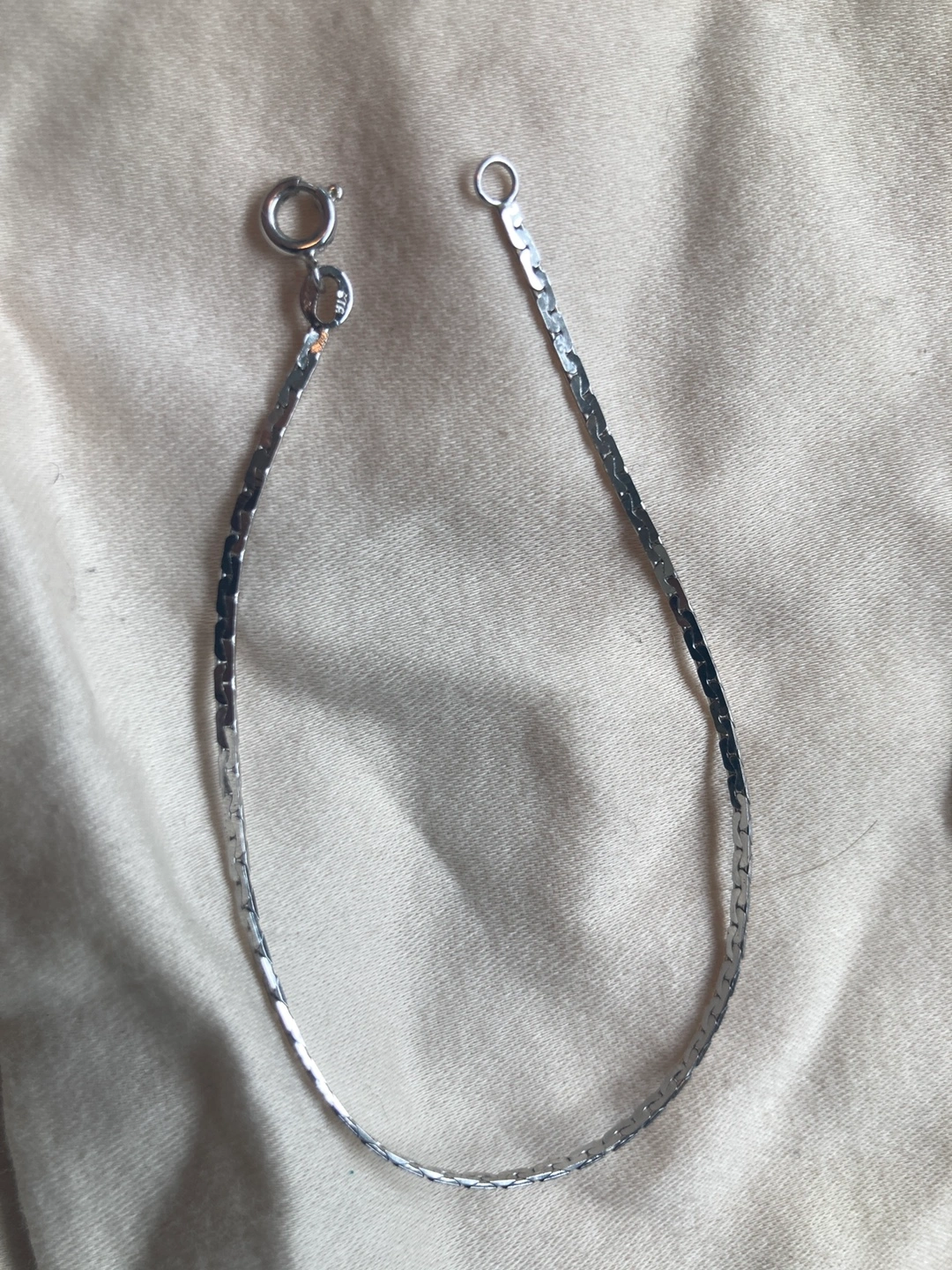 7 “ chain, it has a very unique interlocking pattern that lies flat. i am unsure what the metal is.