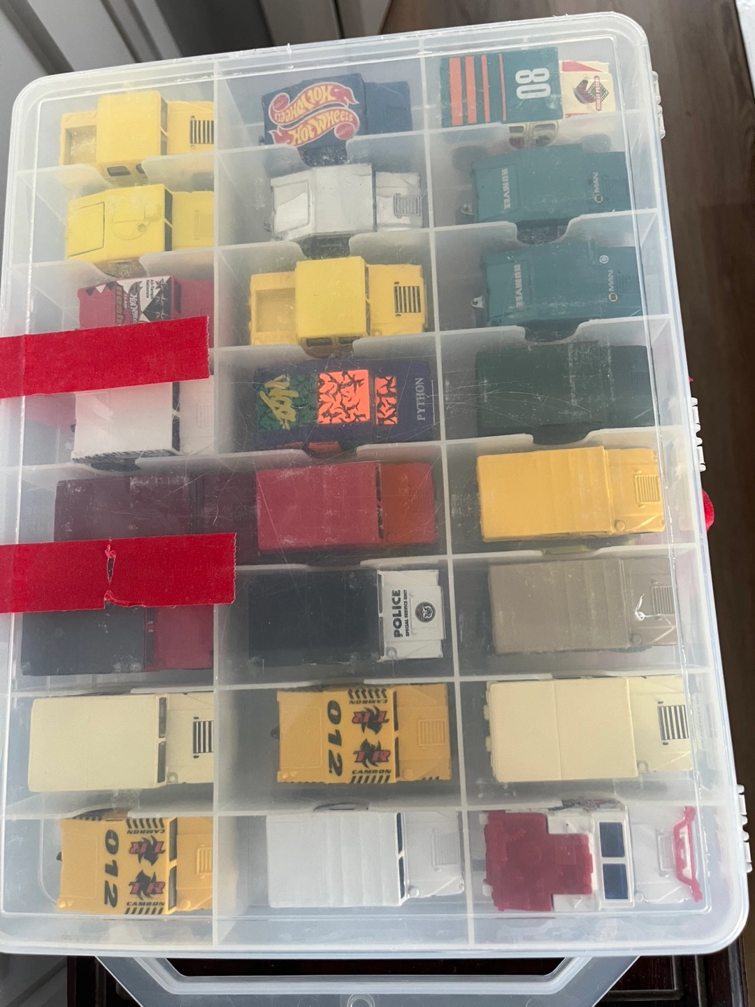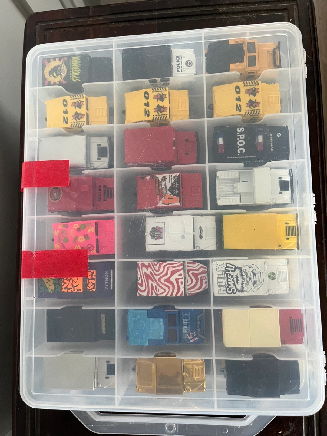 Selling a collection of Hot Wheels trucks, all neatly organized in a storage case! They are all versions of Hummers. There's a variety of colours and designs, perfect for collectors or kids who love playing with toy cars. A fun addition to any collection!
