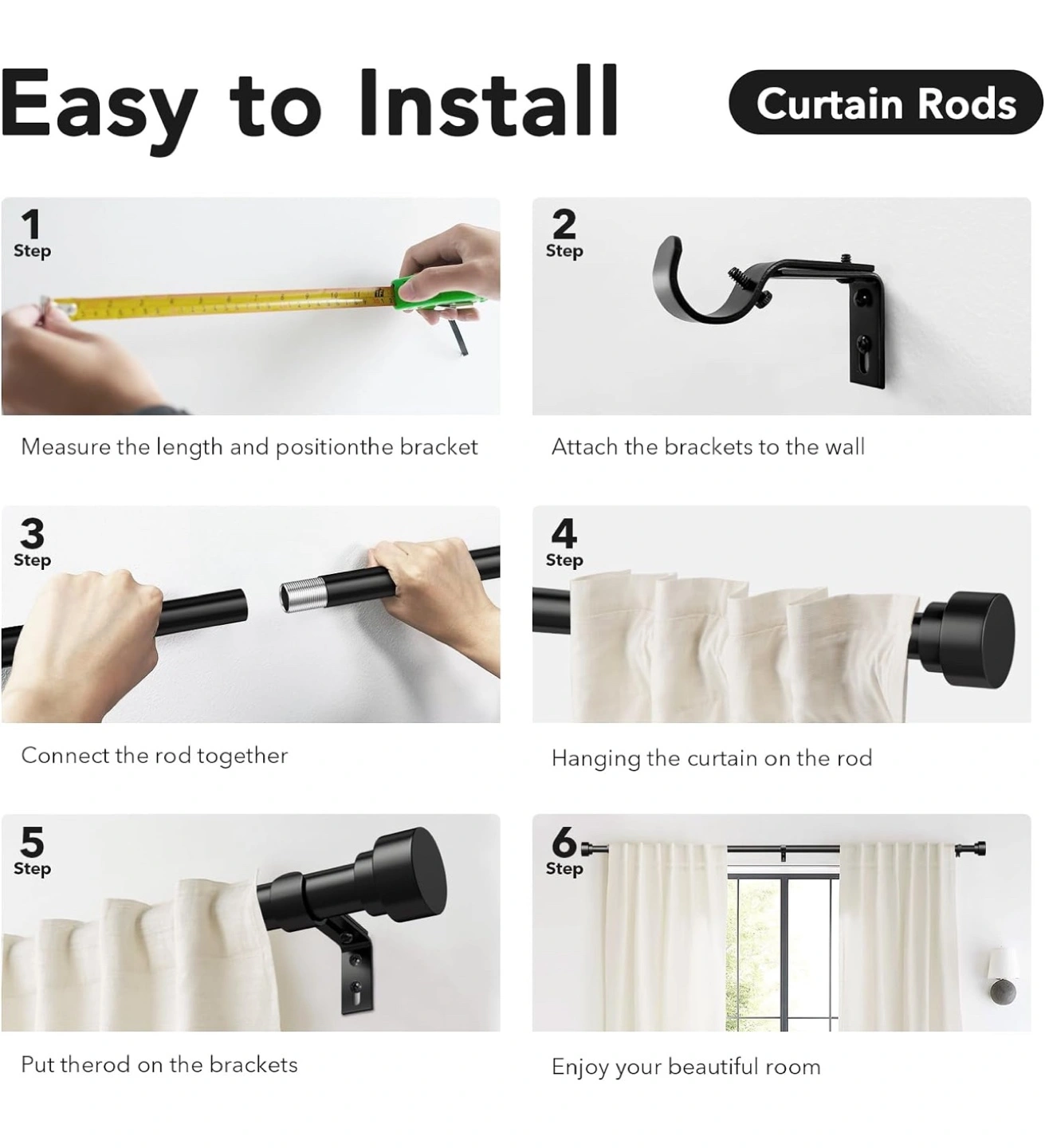 Easy to install curtain rod! It comes with brackets to attach to the wall, and you can connect the rod together. The size of the curtain rod can be adjusted by adjusting the number of fixed rods and the expansion distance of the adjustable rod